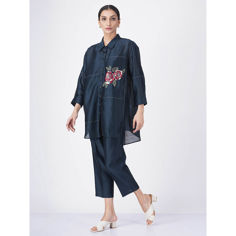 Description : Upgrade your style with this indigo co-ord set from ARCVSH by Pallavi Singh. Made from high-quality chanderi, the shirt features three fourth sleeves, a collar neck and an embroidered pattern, finished with a mid-waisted pant and a slip. Style it with minimal jewellery and sandals to complete the ensemble.