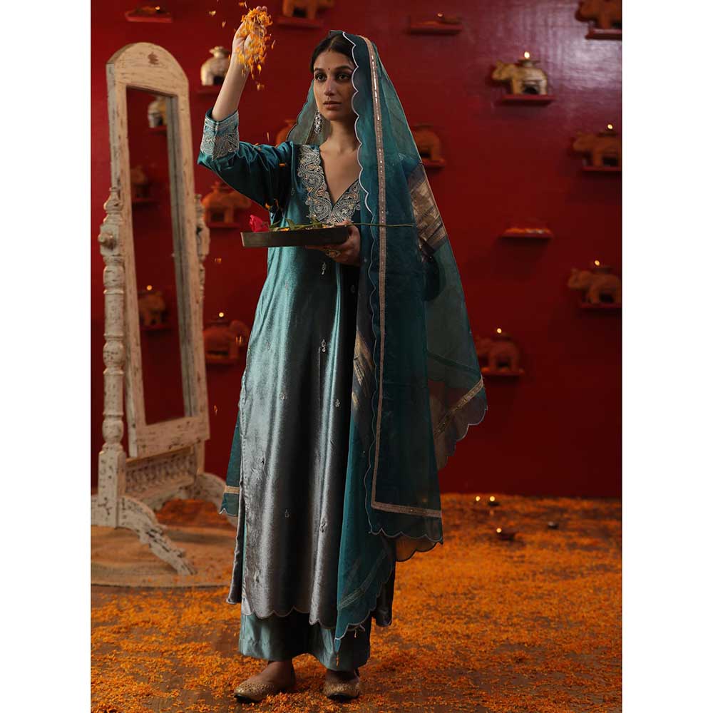 Arpita Sulakshana Firozi Ombre Velvet Kurta with Pant and Dupatta (Set of 3)