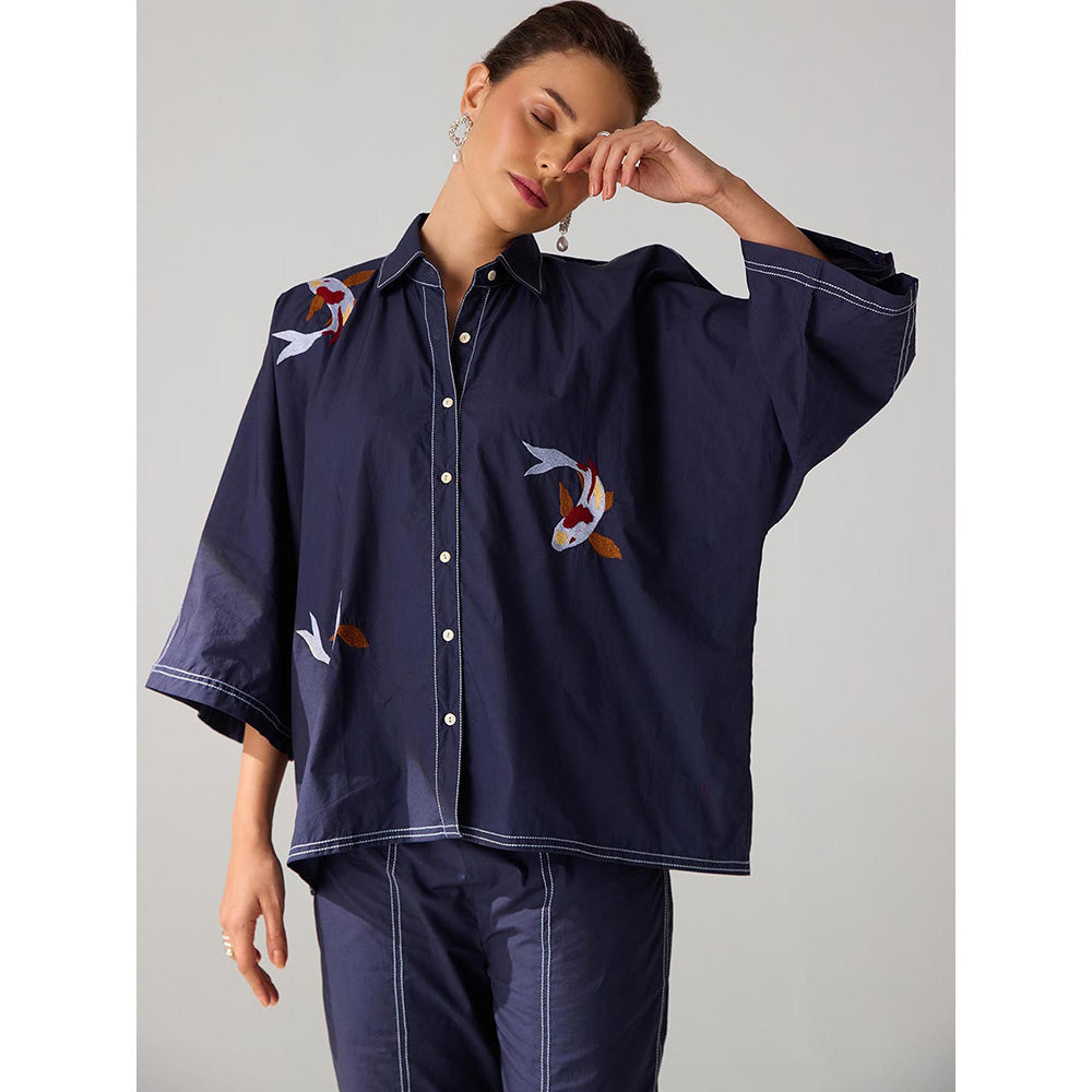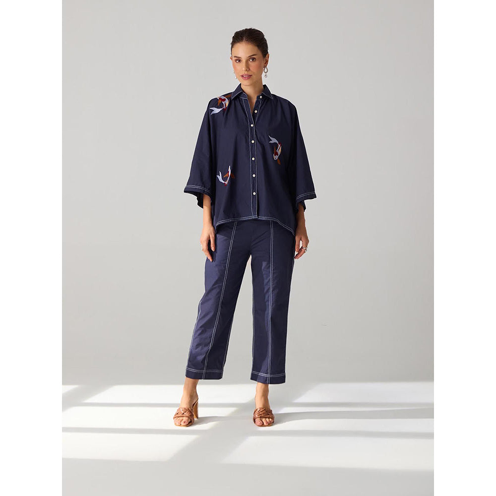 Description : Co-ord Set with hand-embroidered fish motifs and highlighted with contrast stitch featuring relaxed fit shirt paired with straight fit Pants. The solid pants features curved insert pockets and half elasticated belt. Shirt Length: 25" Pants Length: 36"