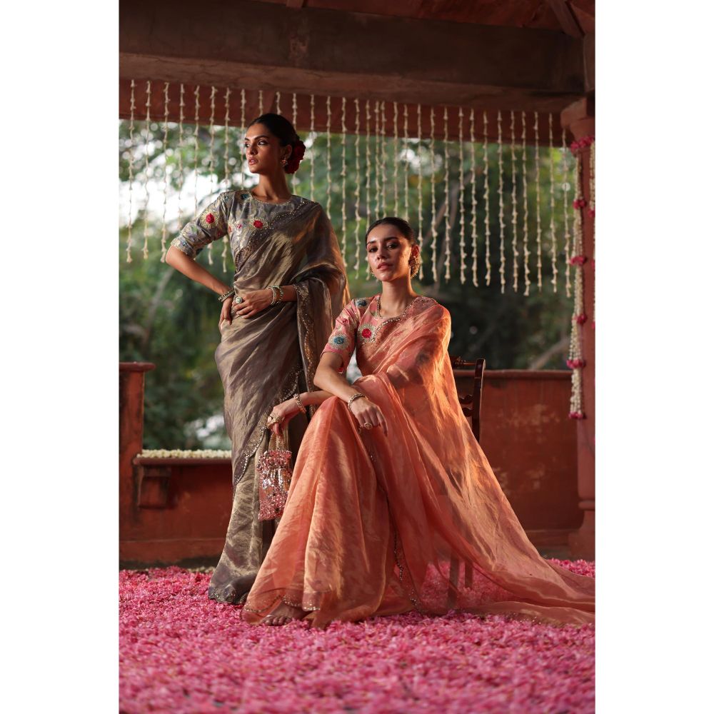 Description : The Tissue Silk Saree Adorned with Delicate Scalloped Edges with Hand-Embroidered Sequin Detailing. Paired with A Richly Designed Brocade Blouse Featuring Intricate Hand Embroidery, Is Perfect For Weddings and Festive Celebrations.
