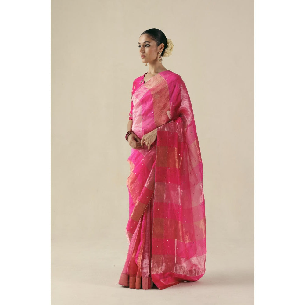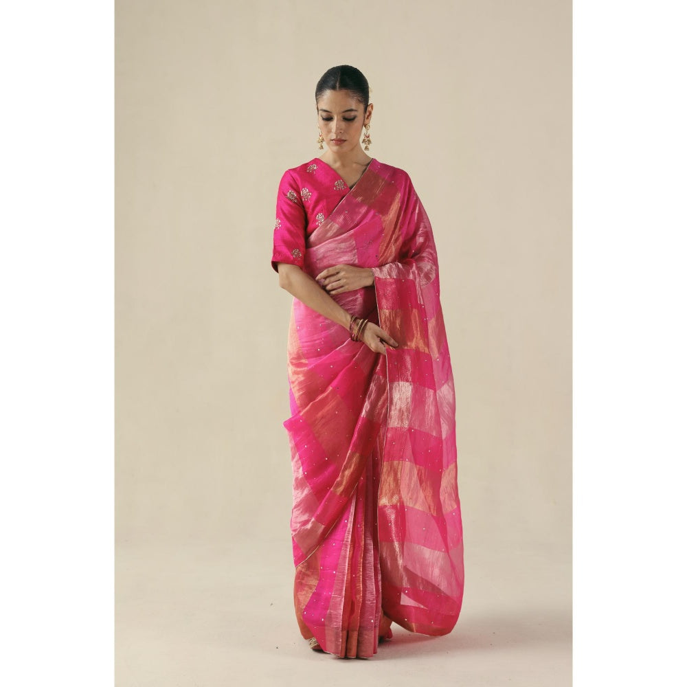 Description : A Celebration Of Vibrant Elegance, The Amber Saree Is Crafted In Luxurious Metallic Tissue Organza Silk In A Striking Pink Hue. The Saree Shimmers With Delicate Hand-Embroidered Mukaish Work Scattered All Over, Creating An Ethereal Festive Glow. Paired With A Raw Silk Blouse, Meticulously Hand-Embroidered With Dainty Rose Motifs, This Ensemble Is Timeless, Radiant, And Perfect For Festive Occasions That Call For A Touch Of Grandeur.