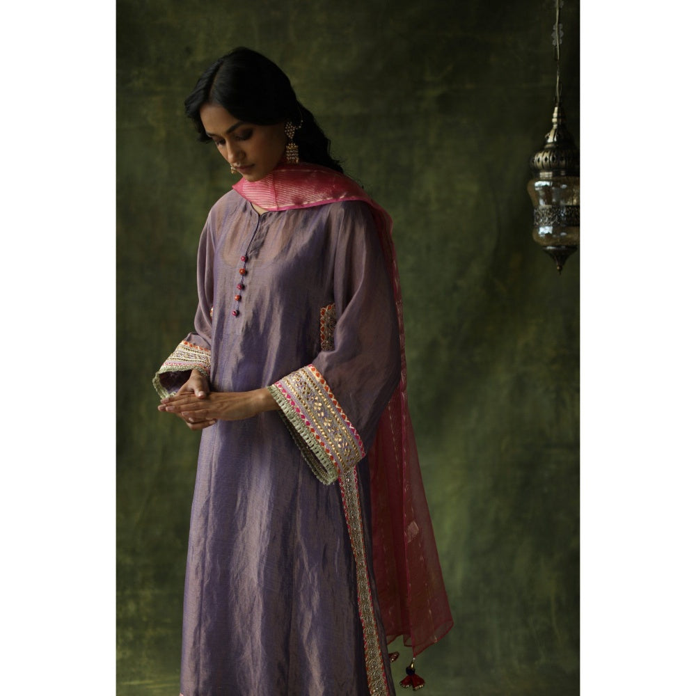 Description : A contrast kurta set in chanderi silk with gota embroideries on the sides, sleeves and the ghera. the pants are a contrast pop with hand embroidered floral bootis. the dupatta with hand made tassels add a further festive pop to the outfit. fabric - chanderi silk kurta, modal satin lowers, satin slip organza dupatta lengths - 46a kurta length, 36a pant length