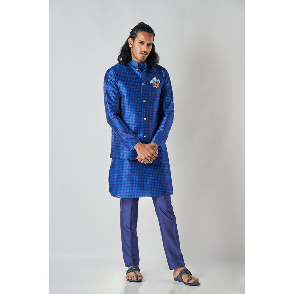 Description : BUBBER BLU Blueton Indigo Helm Bandhi Navy Blue Nehru Jacket. Tailored to sartorial perfection from premium quality fabric, it assures a soft and soothing touch against the skin. The exquisite silhouette adds to its appeal.