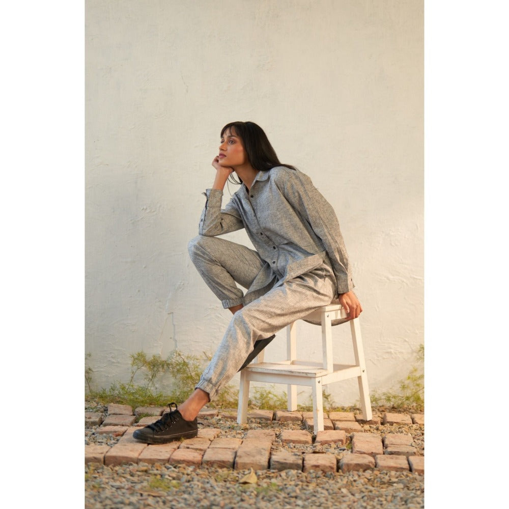 Description : The Grey Co-Ord Set Presents A Contemporary Silhouette Crafted From Classic Textured Cotton. This Modernized Shirt Showcases A Relaxed Shape, Accentuated By An Innovative Asymmetric Placket. The Design Incorporates An Intriguing Pleated Panel On The Left Side. Paired with Joggers Boasting Tapered Legs, These Trousers Are Equipped with An Elasticated Waistband Featuring Drawstrings Adorned with Metal Accents.