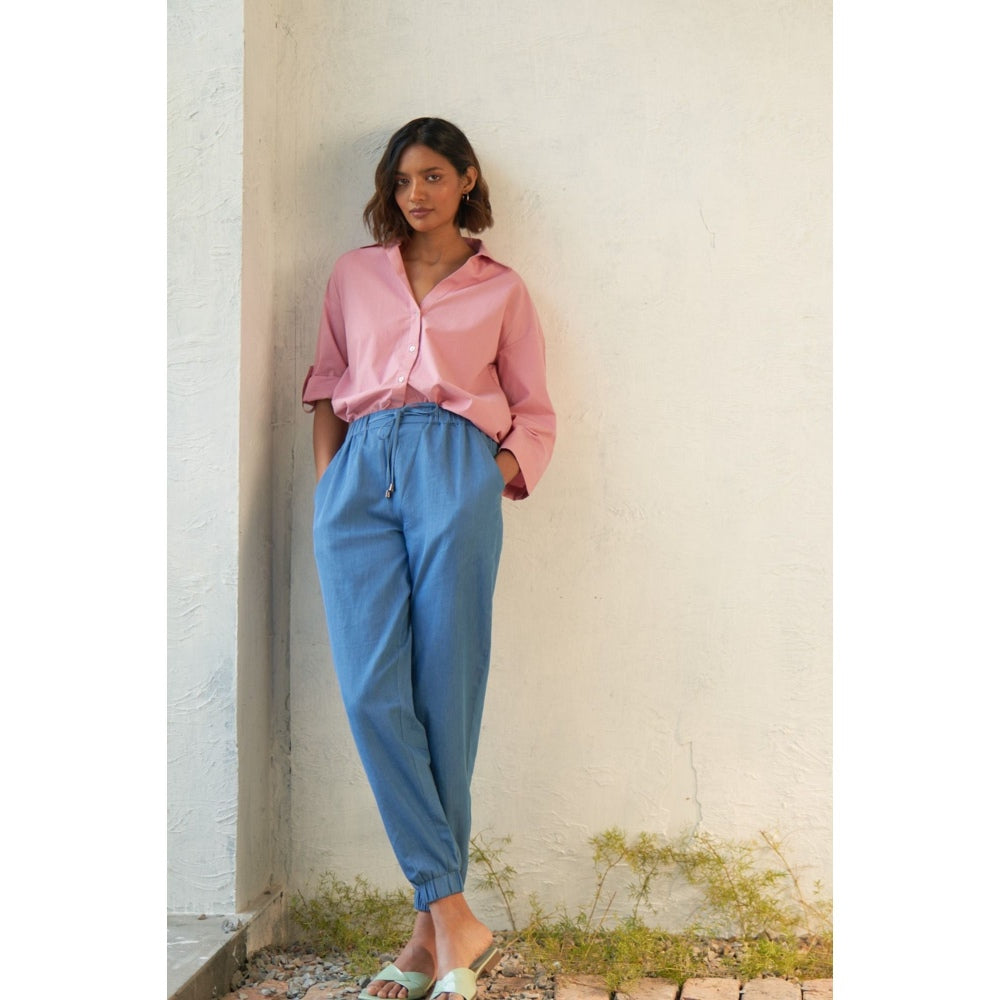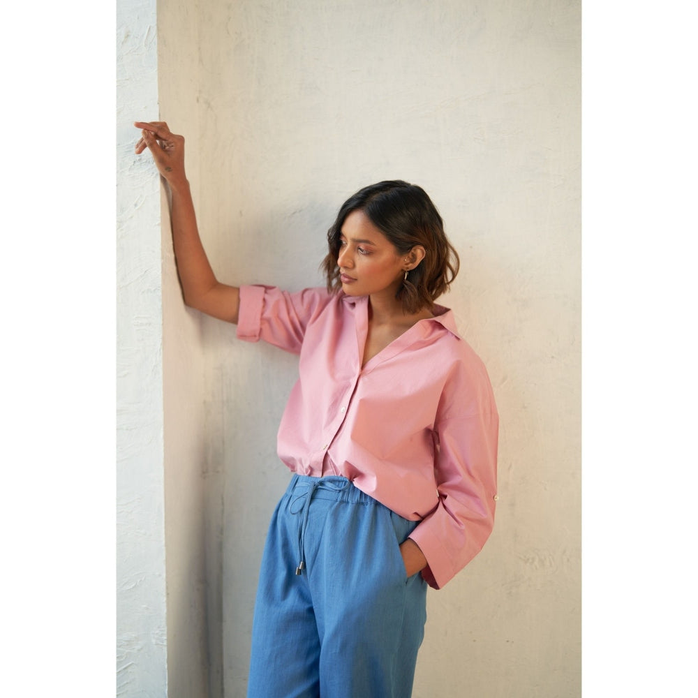 Description : Our Flowy Blush Pink Shirt, Crafted From Pure Cotton for Ultimate Comfort. Designed with An Oversized Fit, V-Neck, Curved Hemline, and Elegant Shell Buttons, It Exudes Effortless Style. Paired with Tapered Joggers Featuring An Elasticated Waistband with L Drawstrings, This Ensemble Offers Both Comfort and Sophistication. Complete with Clean Welt Pocket Detailing, It's Perfect for Any Outing.