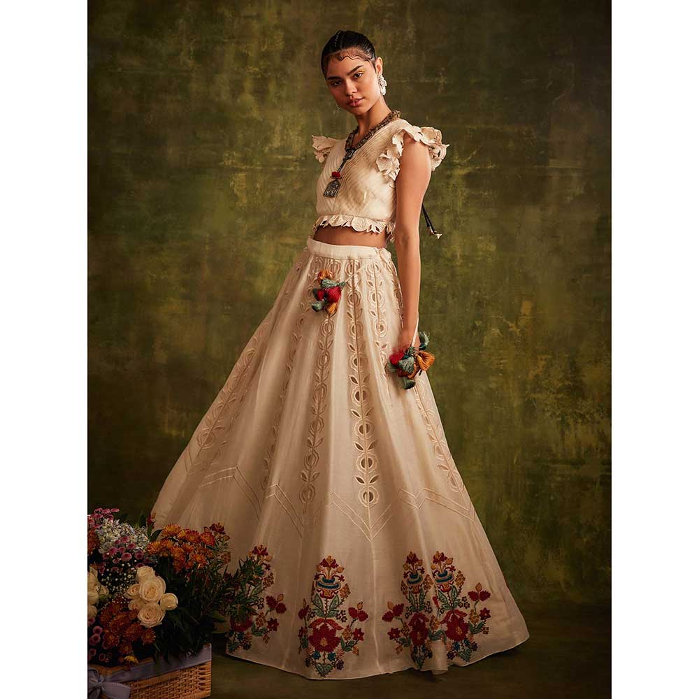Description : IVORY PLEATED TOP WITH CUTWORK RUFFLES