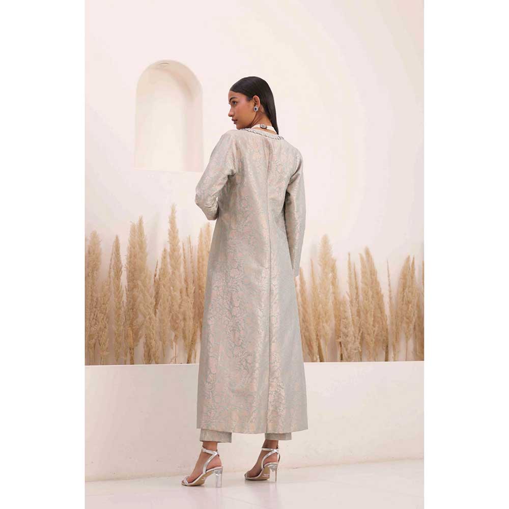 Description : Sage Blue Silk Satin Cowl Top Paired With Sage Blue Brocade Pants And Long Jacket.
