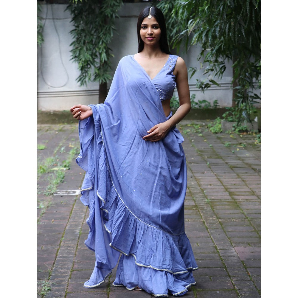 Jugnu Evening Blue Mulmul Cotton Saree with Stitched Blouse
