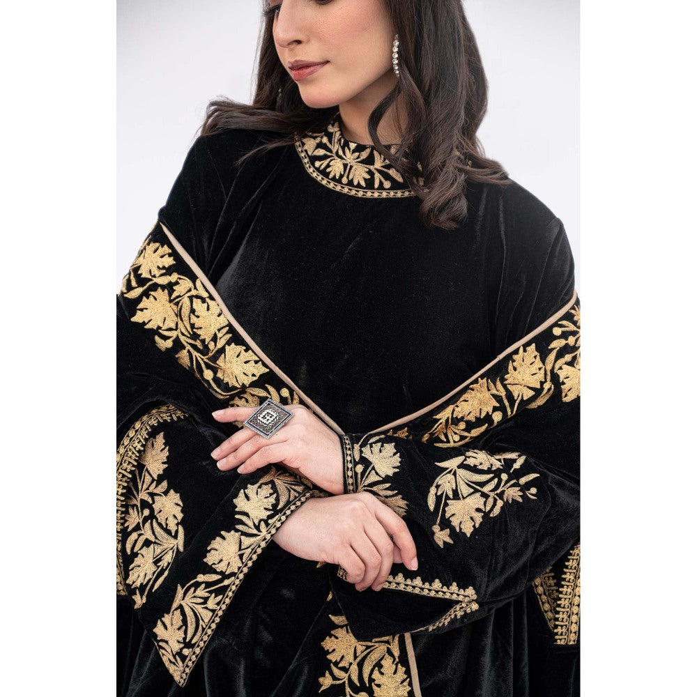 Description : Elevate Your Style With The Black Velvet Chinar Border Cape Set By Daljit Sudan. This Luxurious Set Includes A Velvet Cape, A Kurta With Long Sleeves, And Matching Pants, All Featuring Intricate Aari Embroidery. Perfect For Special Occasions, It Offers A Sophisticated Blend Of Comfort And Elegance.