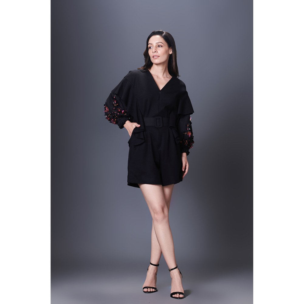 Description : Black Playsuit With Hand Embroidered Sleeve & Belt