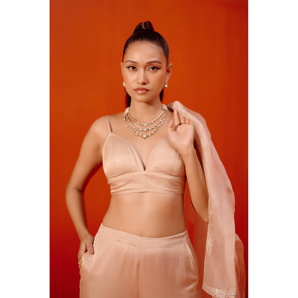Description : This set features a beige organza jacket with exquisite Dori embroidery and Mirror work. The jacket is paired with a beautiful cotton silk satin bustier and matching pants.