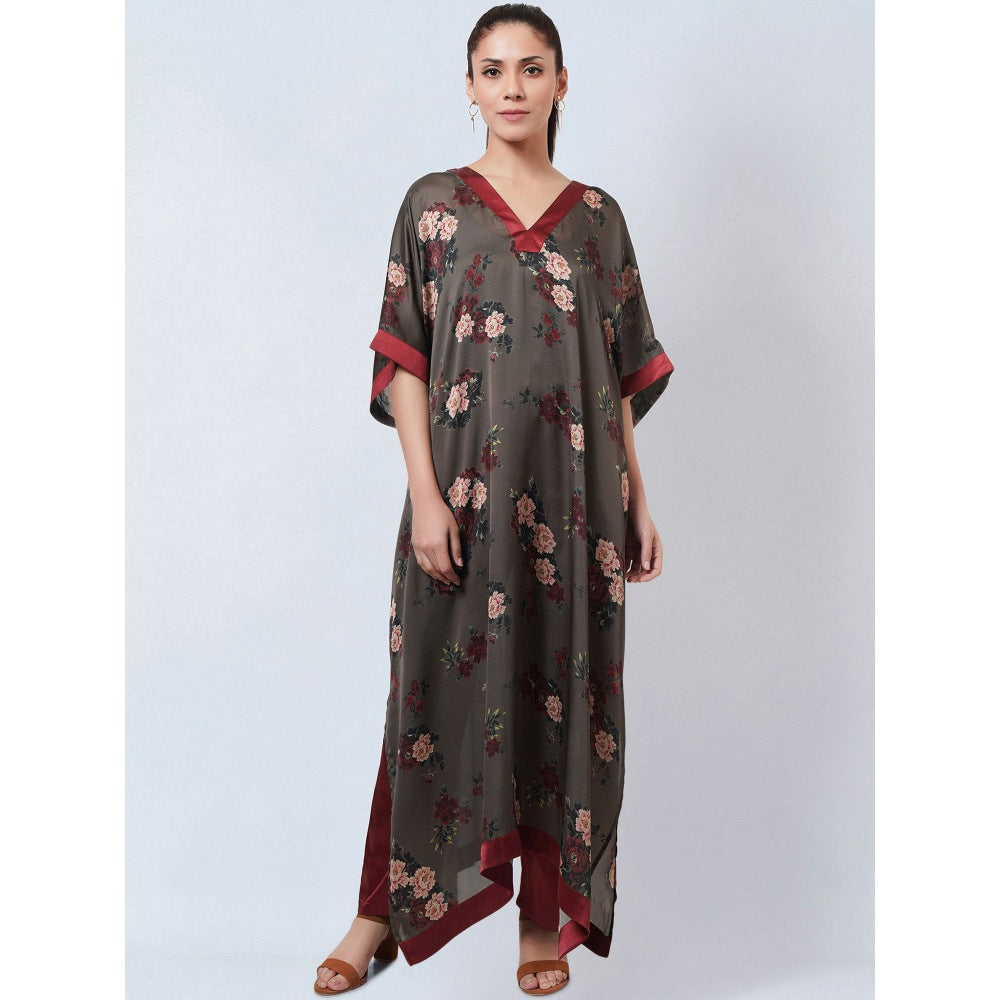Description : Choose subtle yet artsy floral printed kaftan accentuated with matching border around the hem. It comes with satin straight pants which has elasticated waistband for better fit.