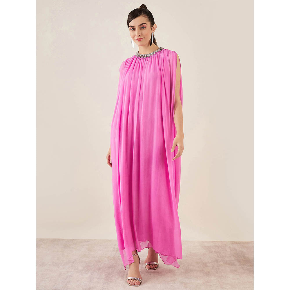 First Resort by Ramola Bachchan Pink Crystal Embroidered & Gathered Silk Full Length Dress