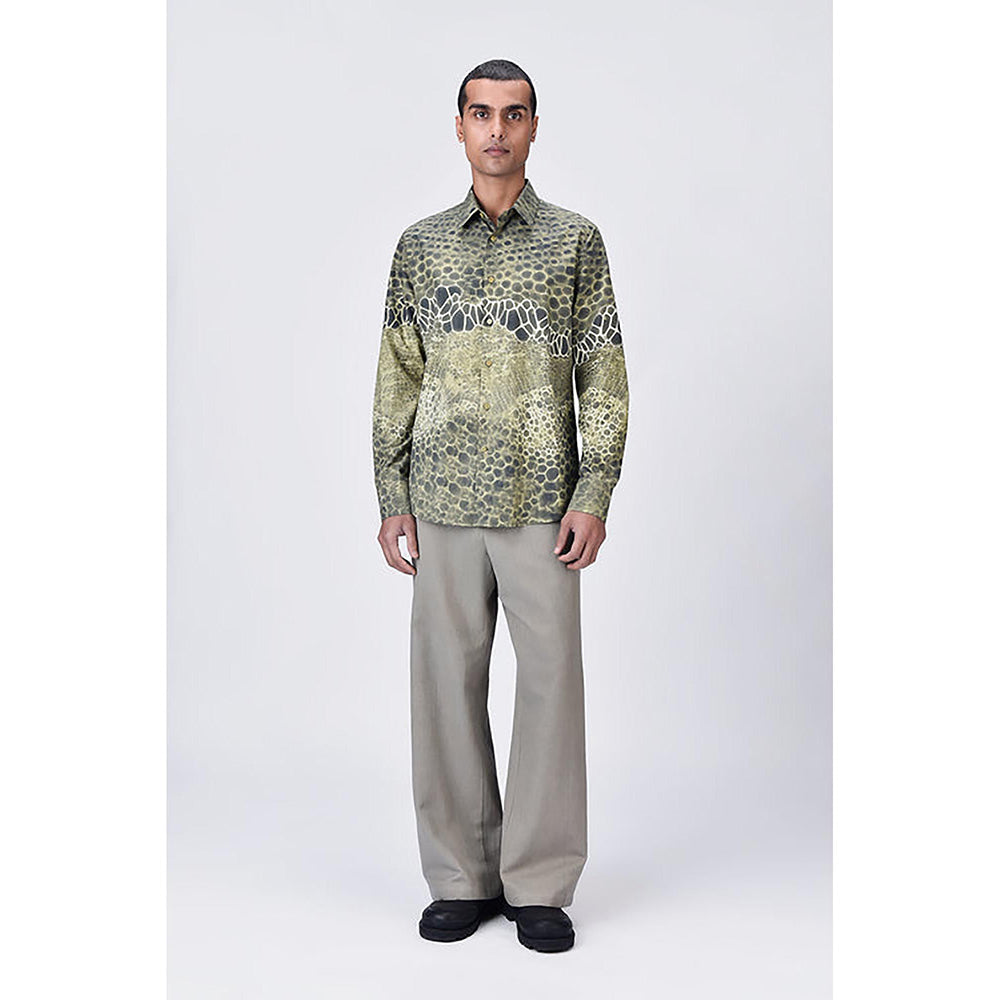Genes Lecointe Hemant Giza Cotton Poplin Button-Up Shirt With Microcell Print - Clay Green