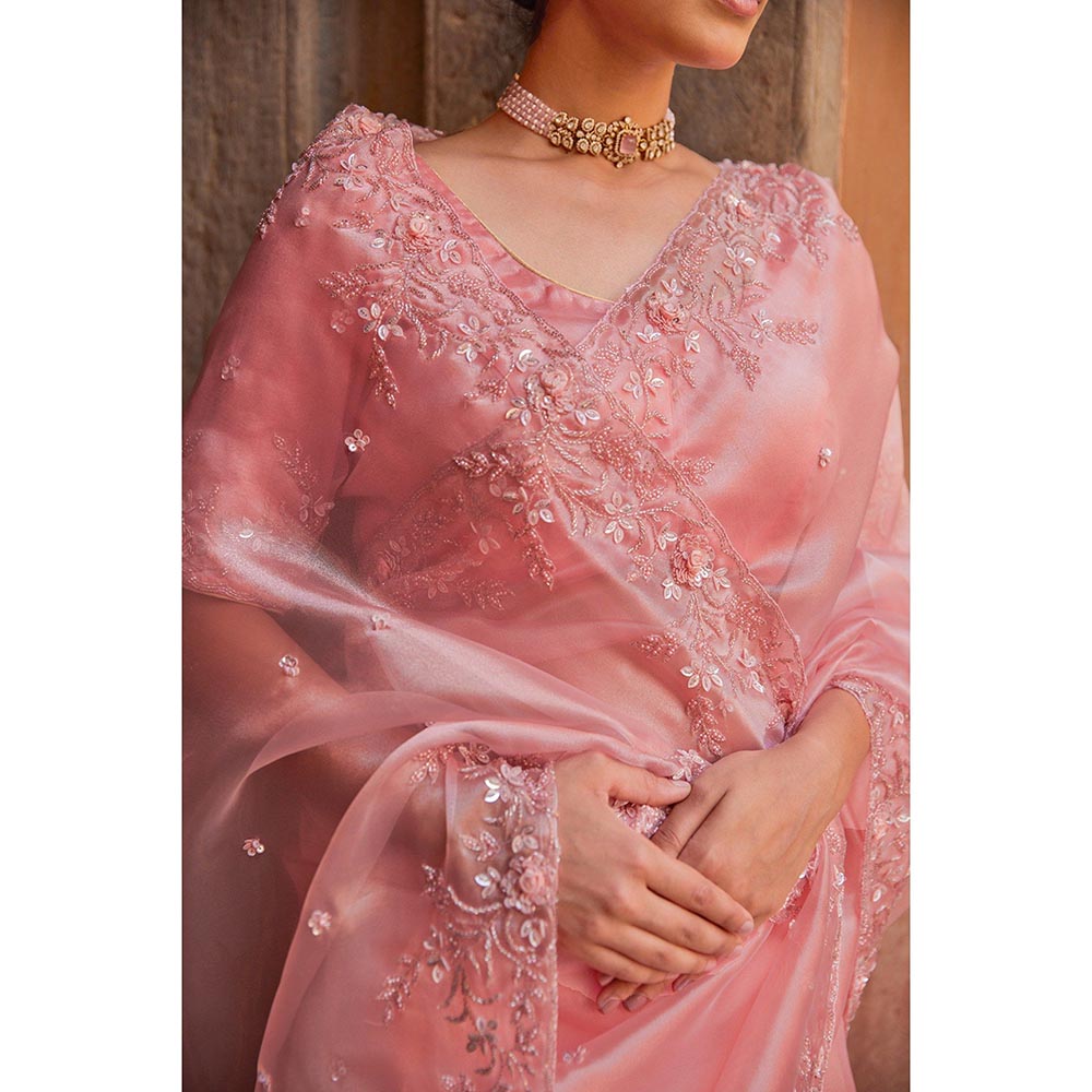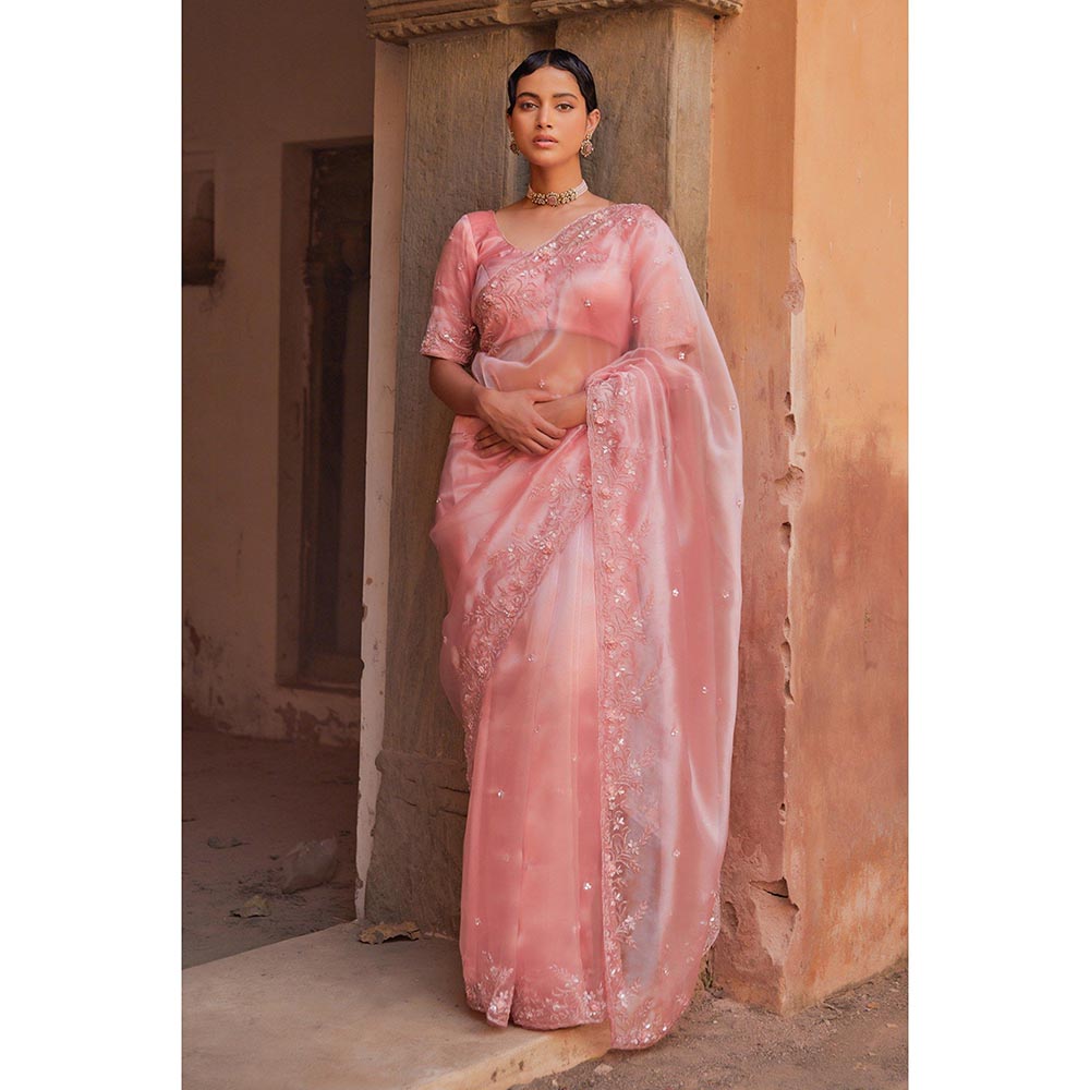 Description : Make a statement with our peach tissue saree set, adorned with intricate embroidery and heavy handwork featuring pearls, tube light, and sequins. This elegant ensemble is perfect for weddings, festive celebrations, and special occasions, offering a blend of traditional craftsmanship and modern sophistication. It comes with an unstitched blouse piece