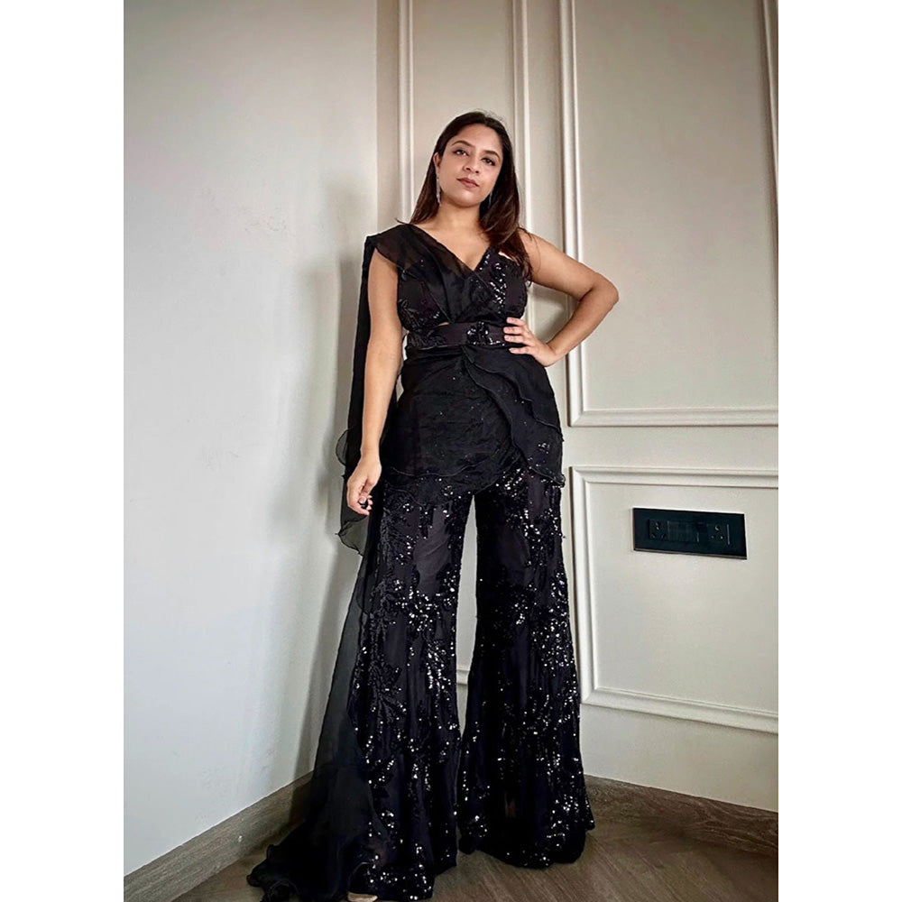 Description : Embrace The Ethnic Grace Of This Two In One Set From Glamique by gungun A Showstopper In Every Sense -This Black Sharara Saree Set Transforms Effortlessly From A Classic Sharara To A Chic Saree Look With A Statement Belt. A Versatile Two-In-One Ensemble, Perfect For Your Cocktail Night Glamour.