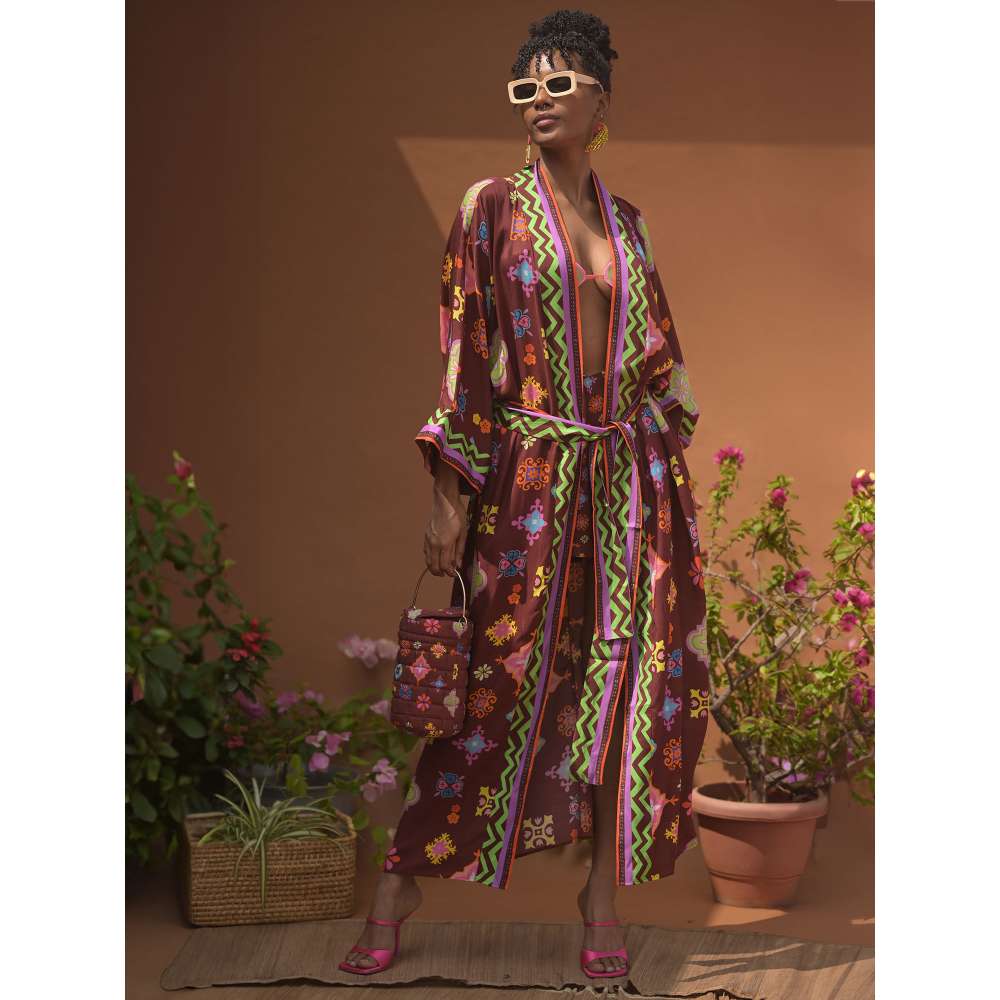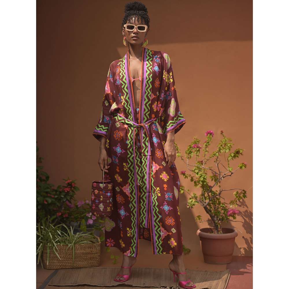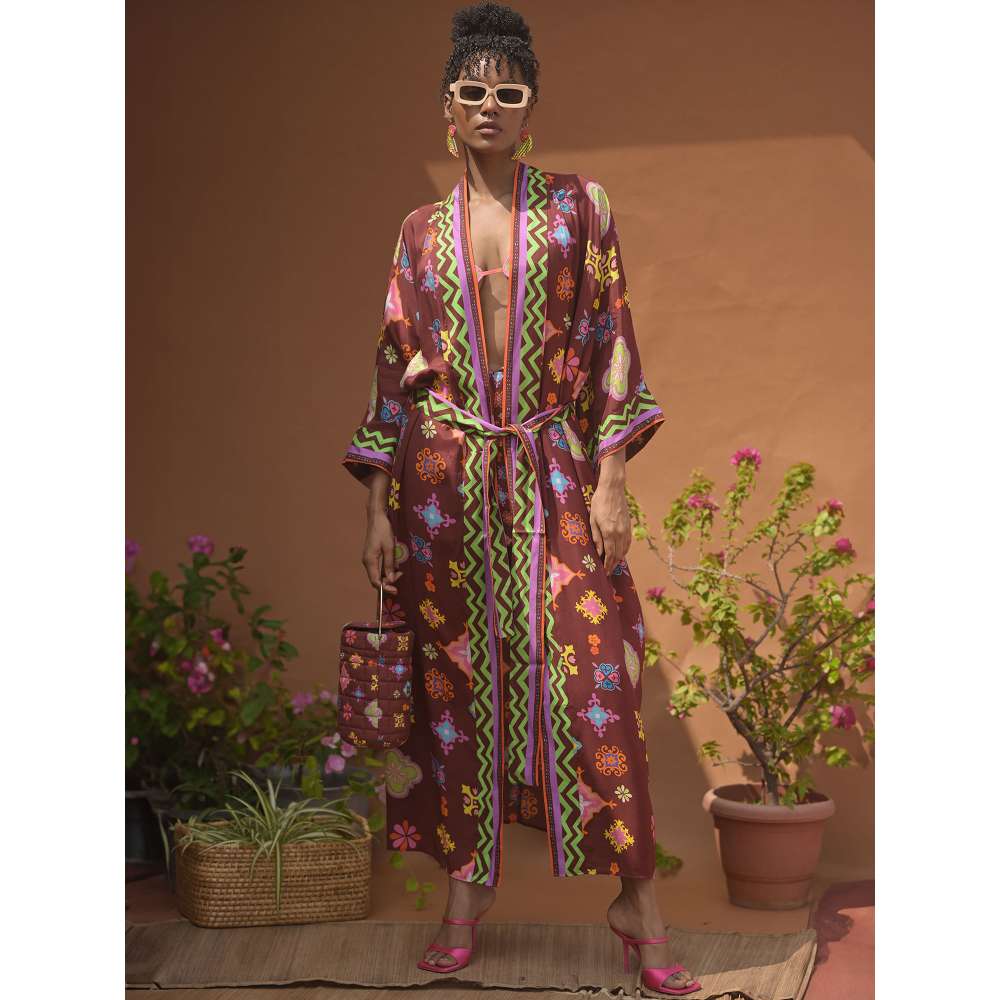 Kalahari Mul Brown Printed Kaftan Robe with Belt (Set of 2)