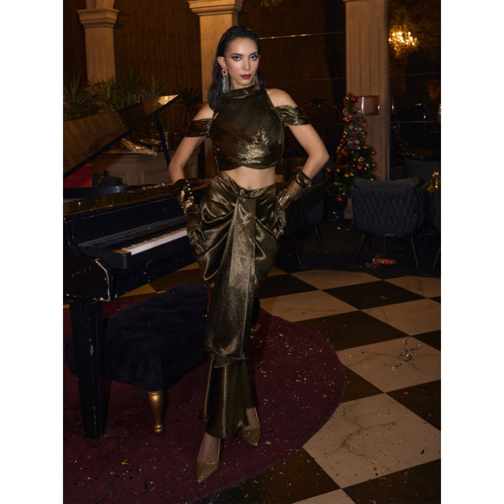 Description : A Legacy Of Style Designed For Unforgettable Moments. This Deep Olive Green Two-Piece Set Redefines Stylish Dressing With Its Unique Design And Luxurious Feel. The Halter-Neck Top, Made From Smooth Lido Satin, Features Attached Gathered Panel That Crosses The Front And Wraps Around To The Back For A Striking Look. With A Side Closure And Two-Button Detail At The Back, It's Designed For Both Comfort And Charm. The Drape Skirt, With Its Dhoti-Inspired Silhouette, Adds Character And Fluidity To The Outfit. Perfect For Those Who Want To Stand Out, This Set Combines Bold Design With A Comfortable Fit.
