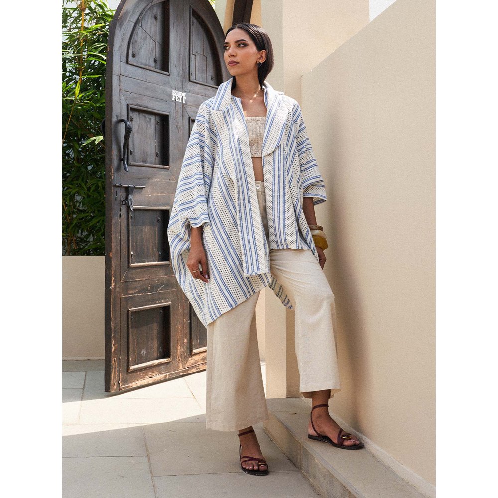 Description : This Comfy Three-Piece Coord Set By House Of Fett Pairs Timeless Elegance With Statement Texture. Featuring A Ruched White Crop Top, Wide-Collared Crochet Jacket With Blue-On-Ivory Stripes, And Straight Cotton Trousers, This Look Brings Layering To Life With Structure And Softness. Ideal For Everything From Resort Vacations To Elevated Errands.
