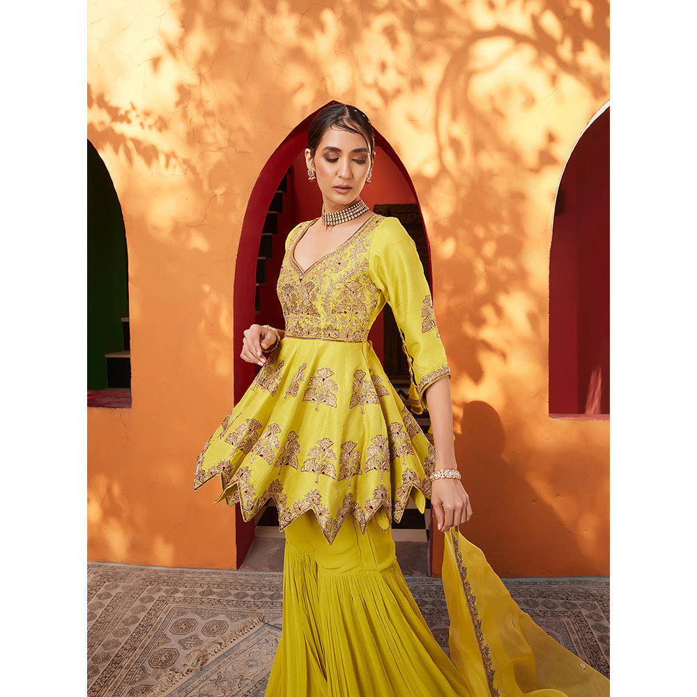 House of Supriya Green Embroidered Raw Silk Kurta & Sharara with Dupatta (Set of 3)