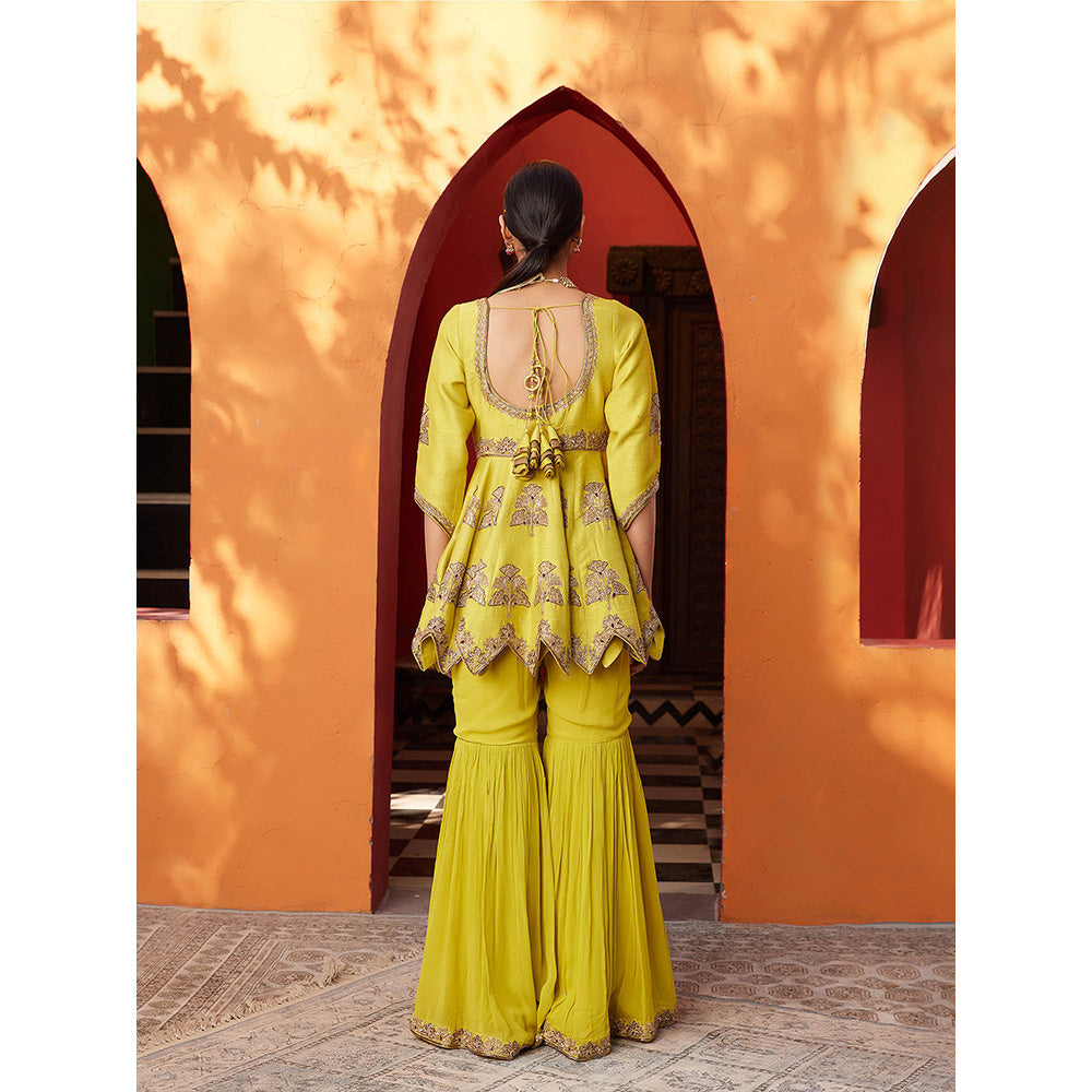 Green Embroidered Raw Silk Kurta & Sharara with Dupatta (Set of 3)