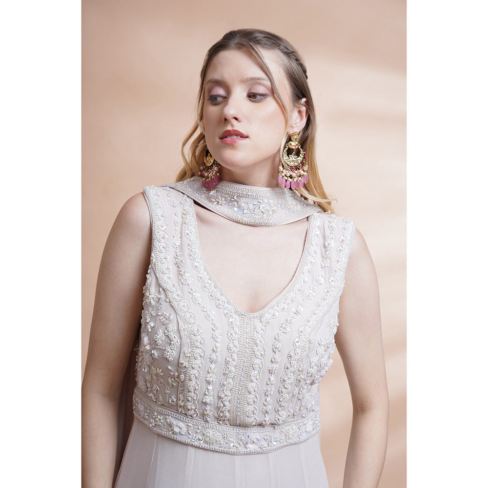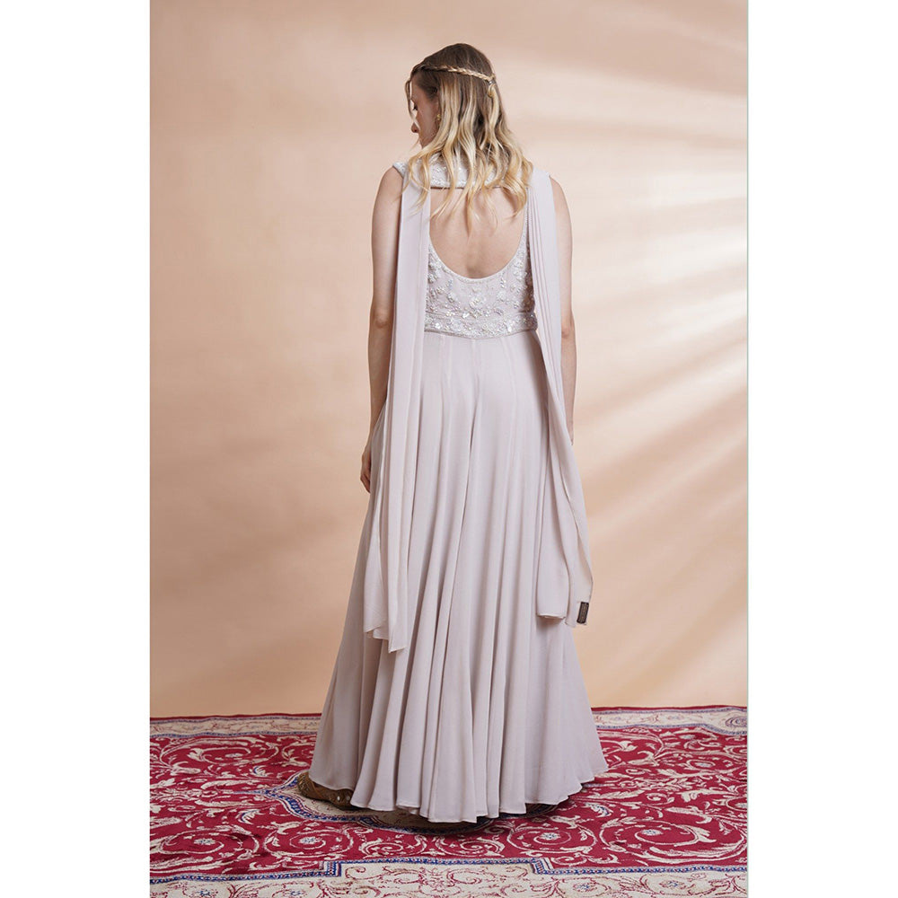 House of Supriya Grey Georgette Flare Gown With Dupatta (Set of 2)