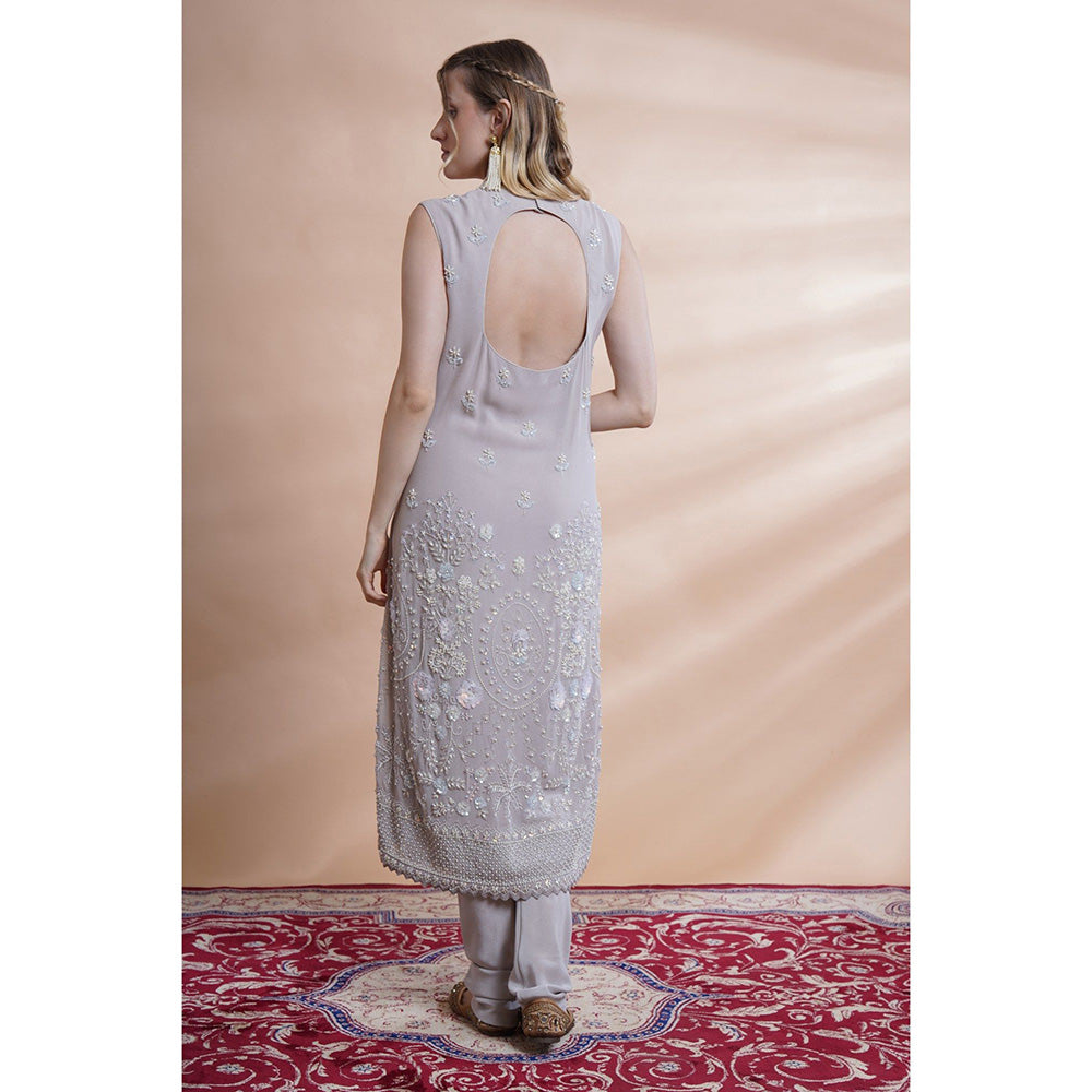 Description : Featuring Grey Georgette Hand Embroidered Incut Kurta With Matching Churidar And Dupatta