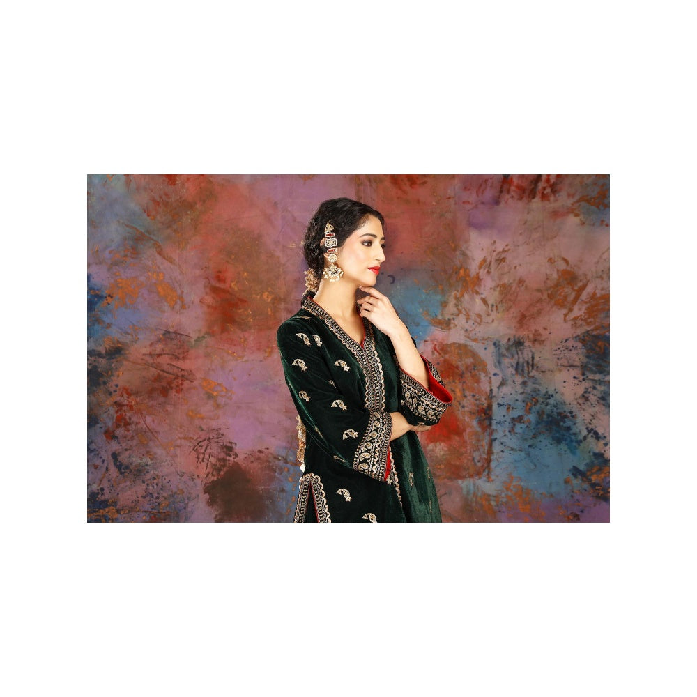 Description : Velvet Short Front Open Jacket With Intricate Embroidery Detailing, Paired With A Sharara Bottom
