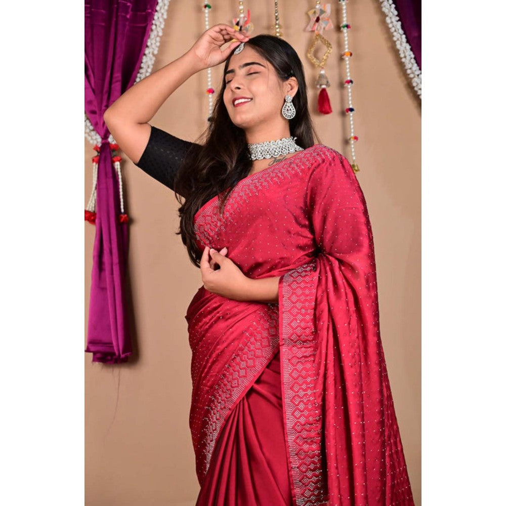 Womens Beads Sequined Red Pre-Draped Saree With Unstitched Blouse