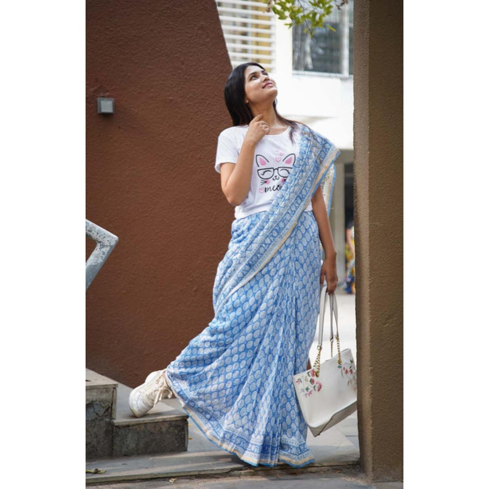 Womens Block Print Blue Pre-Draped Saree With Unstitched Blouse