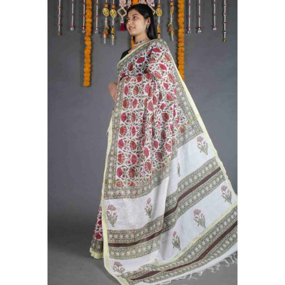 Womens Floral Printed Multi-Color Pre-Draped Saree with Unstitched Blouse