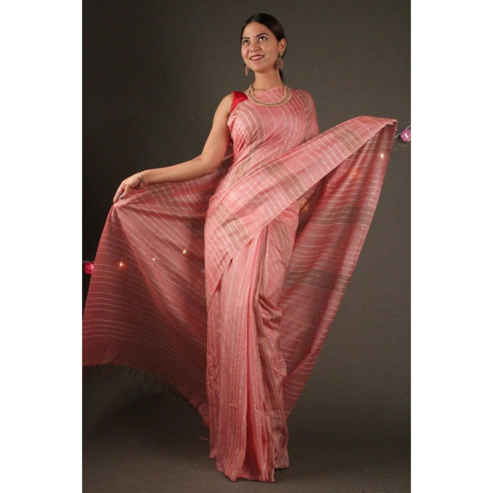 Womens Stripes Tassels Peach Pre-Draped Saree With Unstitched Blouse