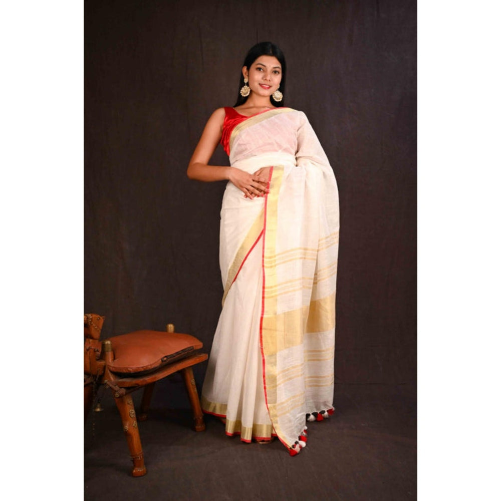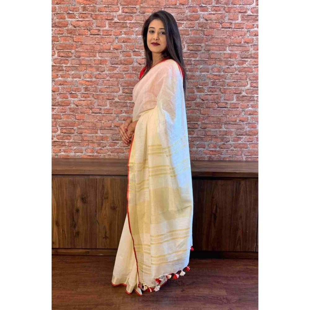 Description : Embrace timeless tradition with our exquisite white saree paired with an unstitched blouse piece, giving you the freedom to customize your perfect fit and style. Crafted from luxurious fabric of cotton linen blend that flows effortlessly, this saree showcases intricate detailing and vibrant hues designed to turn heads at any celebration or festive occasion. The unstitched blouse lets you tailor the look exactly how you envision be it classic, contemporary, or somewhere in between. Whether draped for weddings, parties, or cultural events, this set promises grace, comfort, and endless styling possibilities.