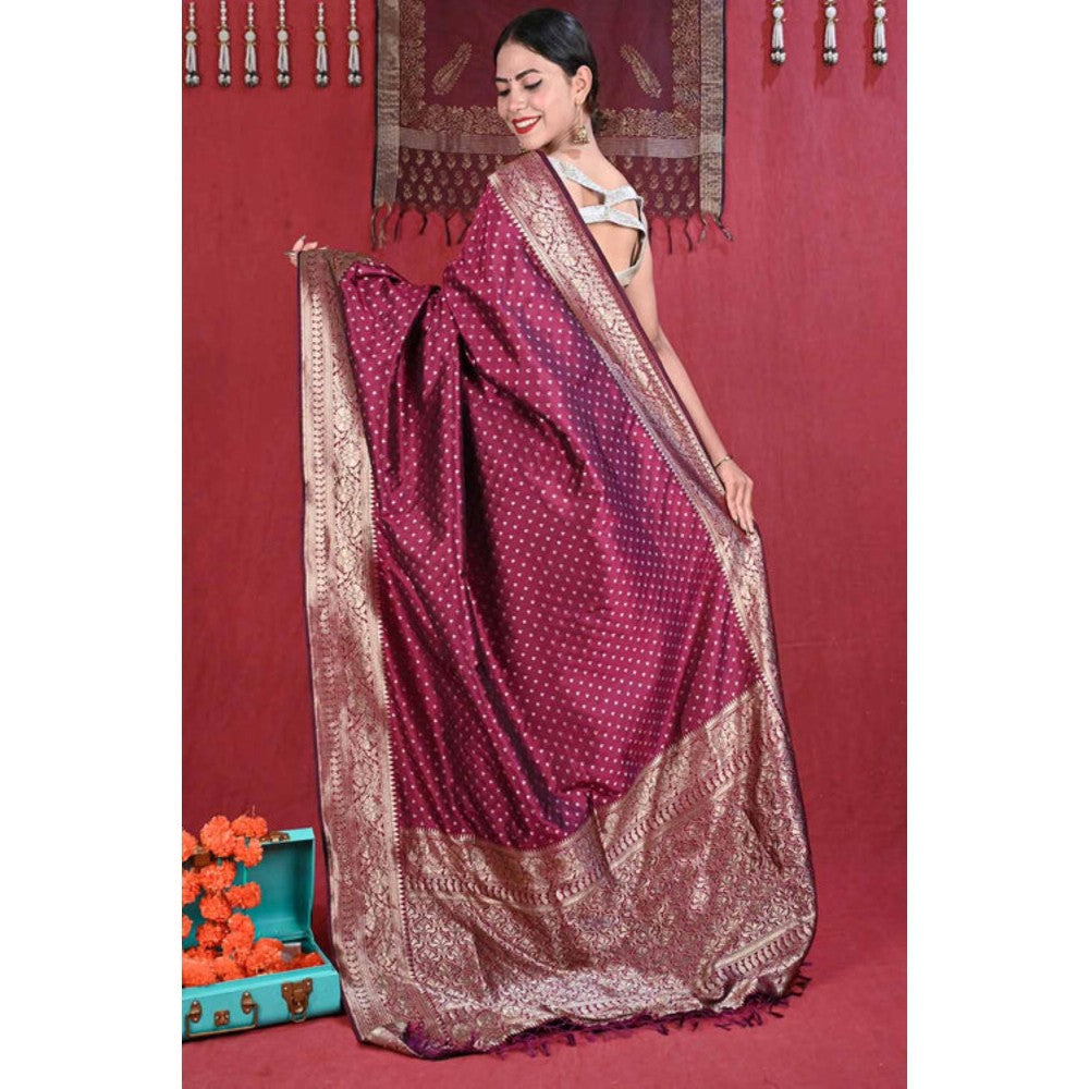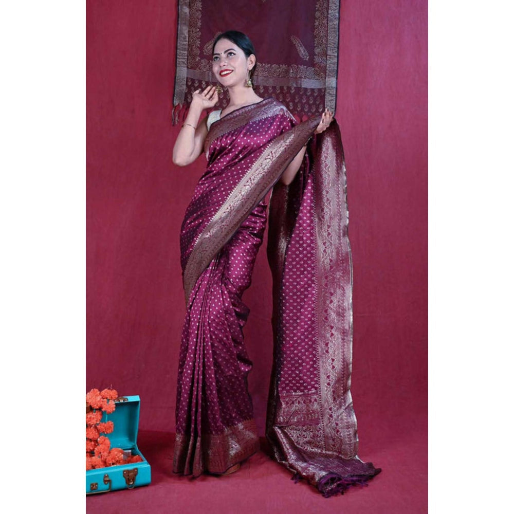 Isadora Life Womens Woven Tassels Wine Pre-Draped Saree With Unstitched Blouse