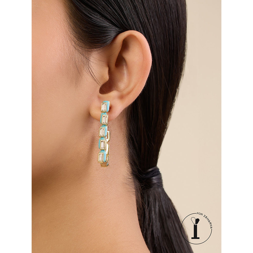 Description : Add a fun pop of color to your everyday or party wear with these Blue Square Hoops. Each hoop is accented with sparkling CZ stones and finished with 18-karat gold plating. So go ahead, be bold and rock these hoops with any outfit!
