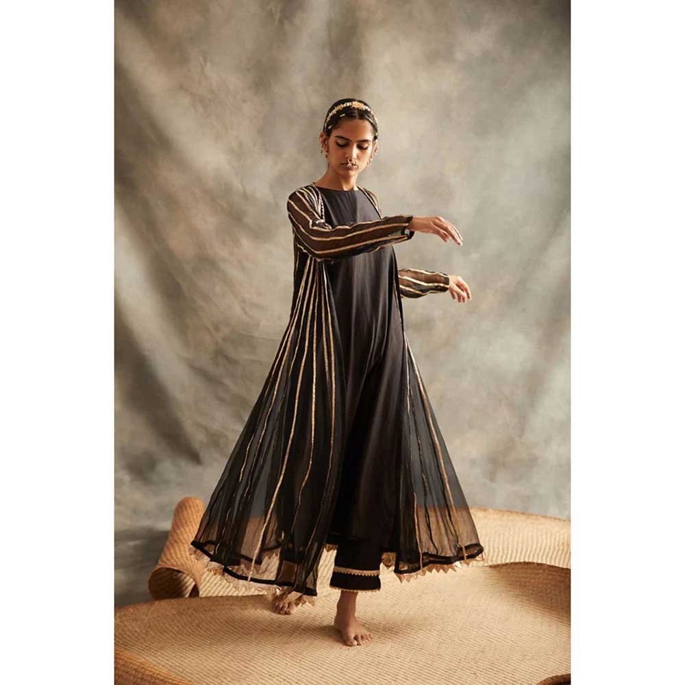 Description : The Plain kurti and pant is made of chanderi with edging of hand made traingles ,while the organza jacket styled with hand made lampi strips and traingles