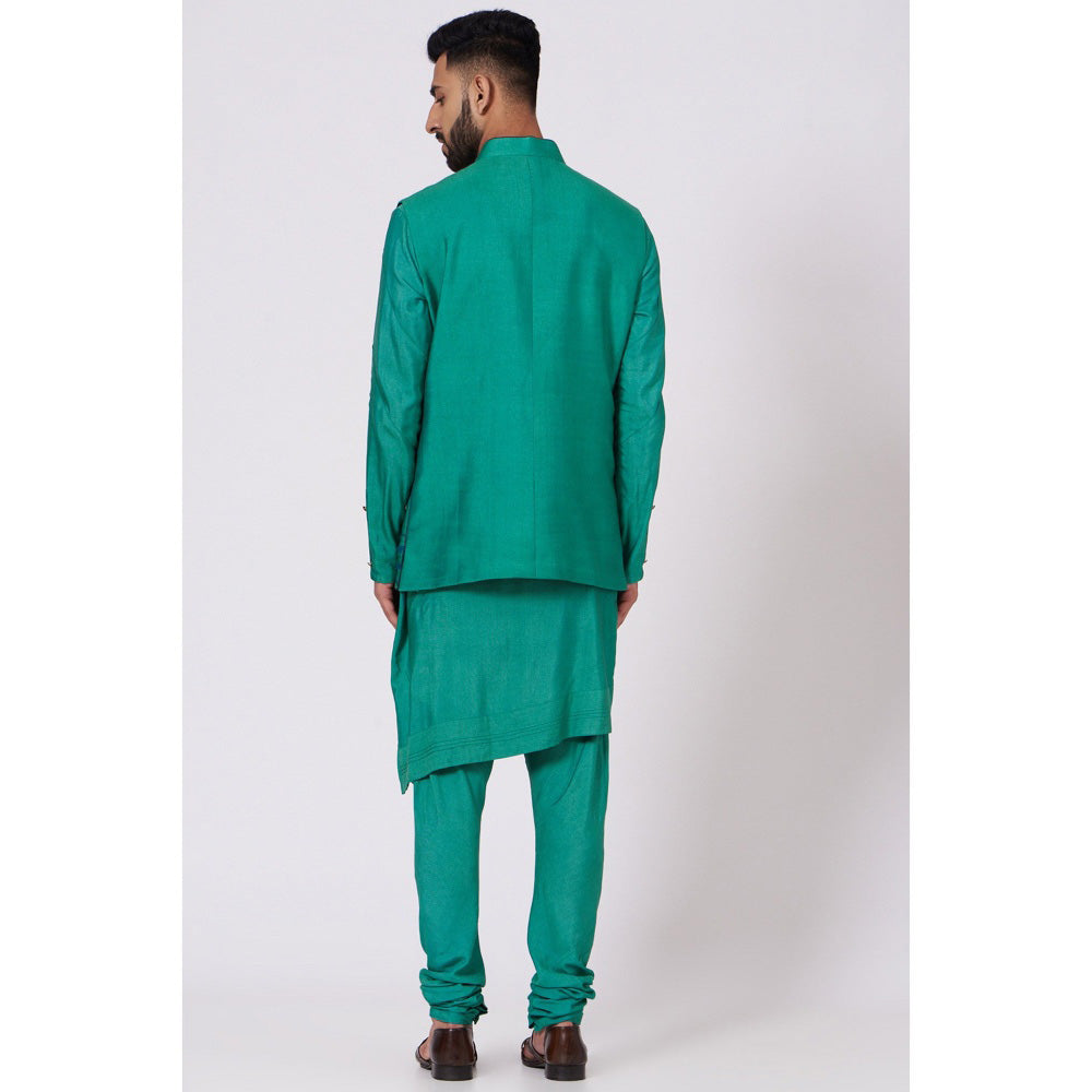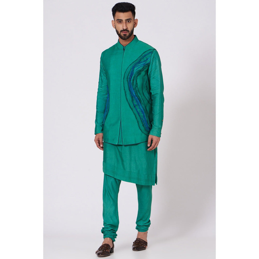 Description : Jade green nehru jacket embossed with hand painted organza. paired