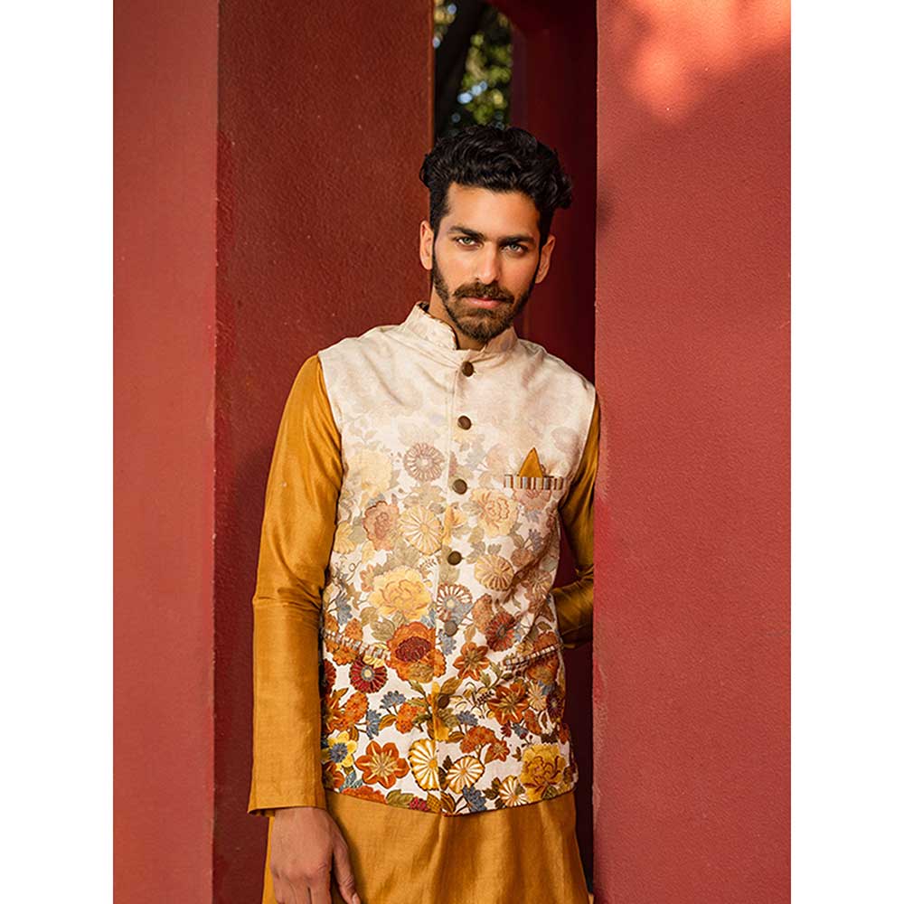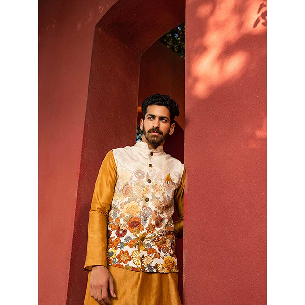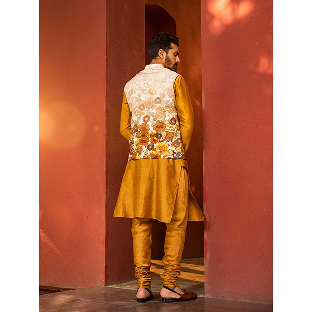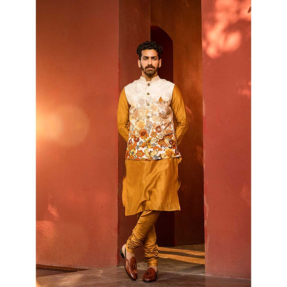 Description : Featuring an intricate bandi with floral print running along the silhouette & textured badla work, paired with the Kurta is to be worn with a matching churidar. Perfect outfit to ace that contemporary indian look.