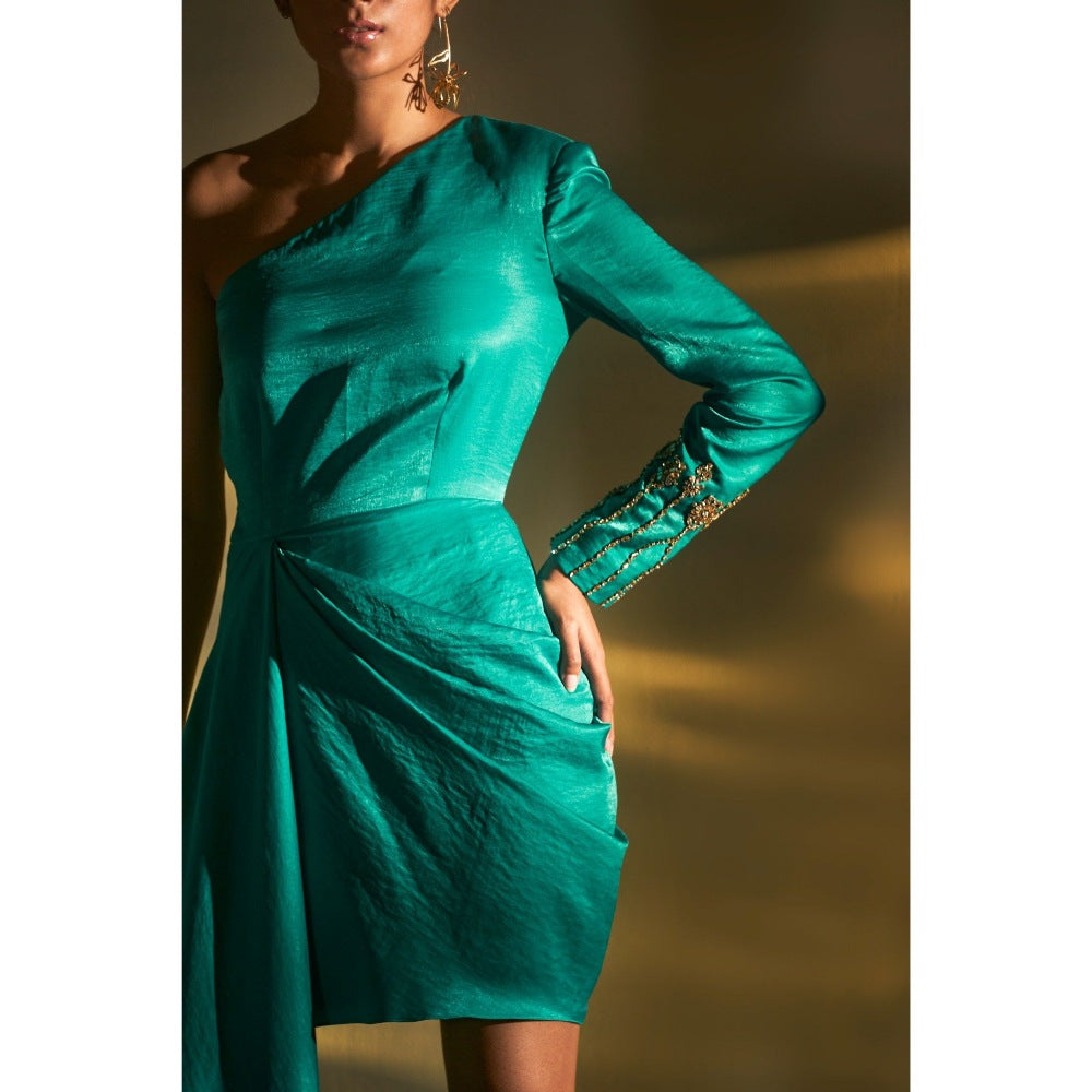 Description : Embrace everyday style by stepping out in this captivating teal one shoulder dress from Kangana Trehan. Made from high-quality satin, this piece features full sleeves and a one-shoulder neckline. Style it with minimal jewellery and sandals to complete the ensemble.