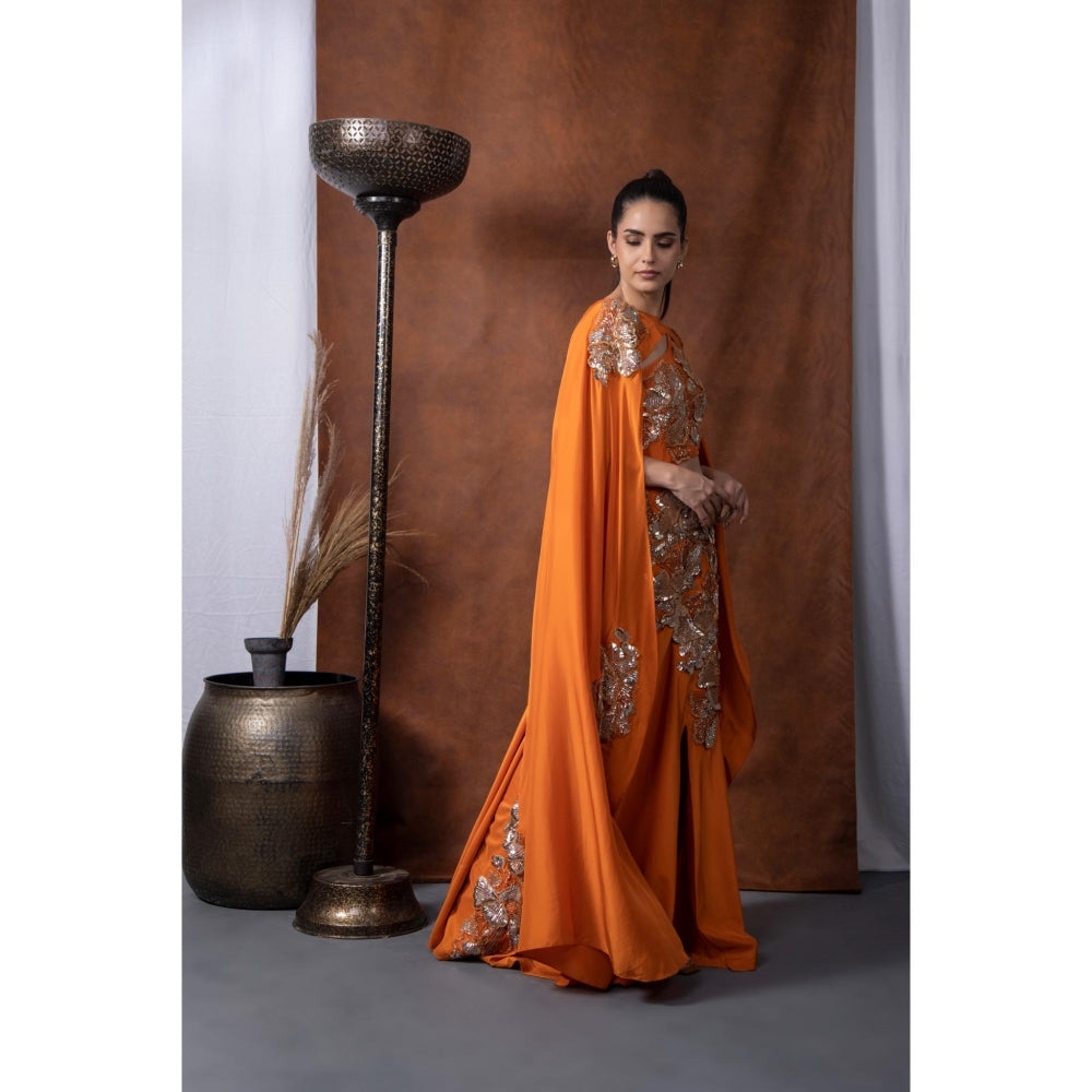 Description : Welcome the festivities in this orange maxi dresses from Kanika Verma. Crafted from silk, this gorgeous set is finished with cape sleeves and a boat neck. Style it with a pair of heels and statement jewellery.
