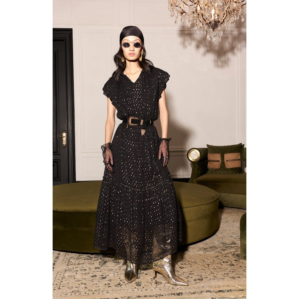 Description : Step into elegance with our black formal dress adorned with golden detailing. This lurex dress is a shimmering masterpiece, adding a touch of timeless charm to your ensemble. It's the perfect choice for a special occasion that demands both gold and black lurex dress
