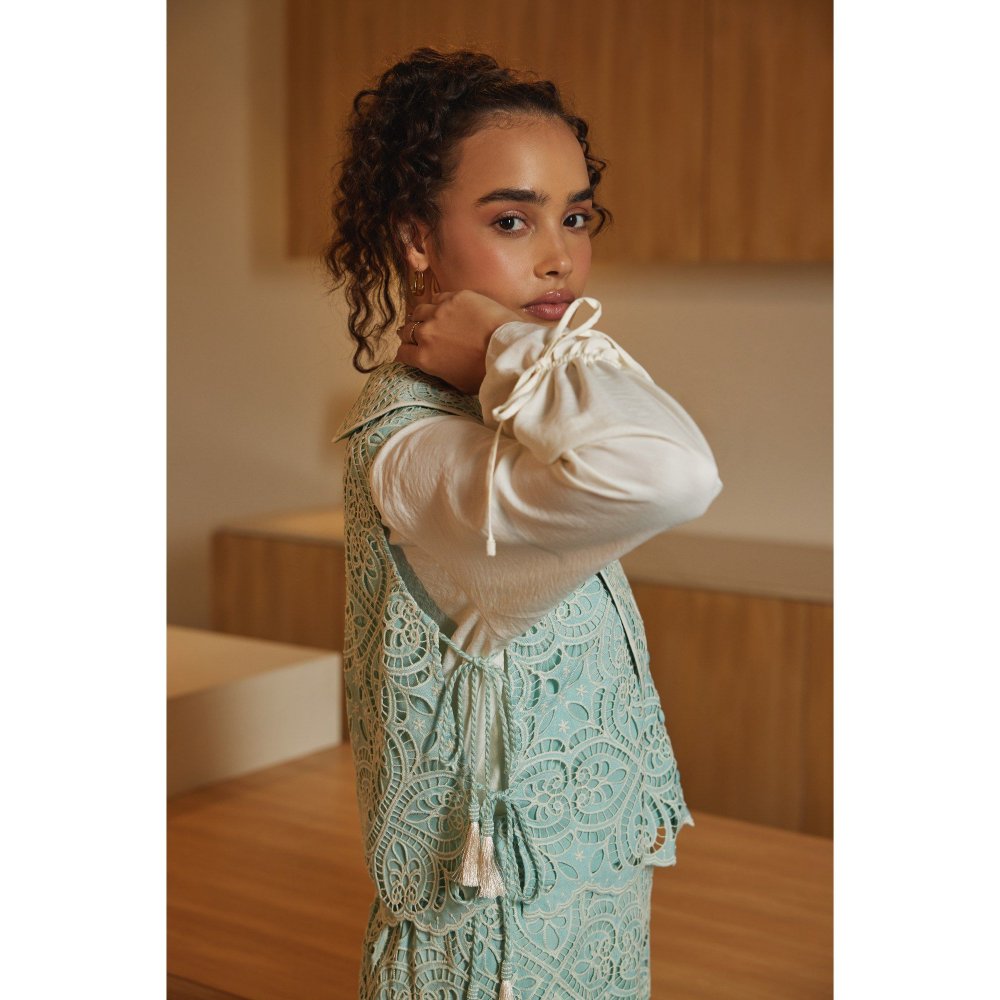 Description : Shirt :Relaxed Fit Shirtfront Closure Concealed Placket Ties with Tassels On The Sleeve Vest :Front Button Closure Contrast Highlights On The Collar Side Open with Ties All-Over Embroidery Pants :Relaxed Fit Straight Pants Elasticated Waistband At The Back Concealed Zipper At The Left Scallop Detail At The Hemal-Over Embroidery Half Pants Lined