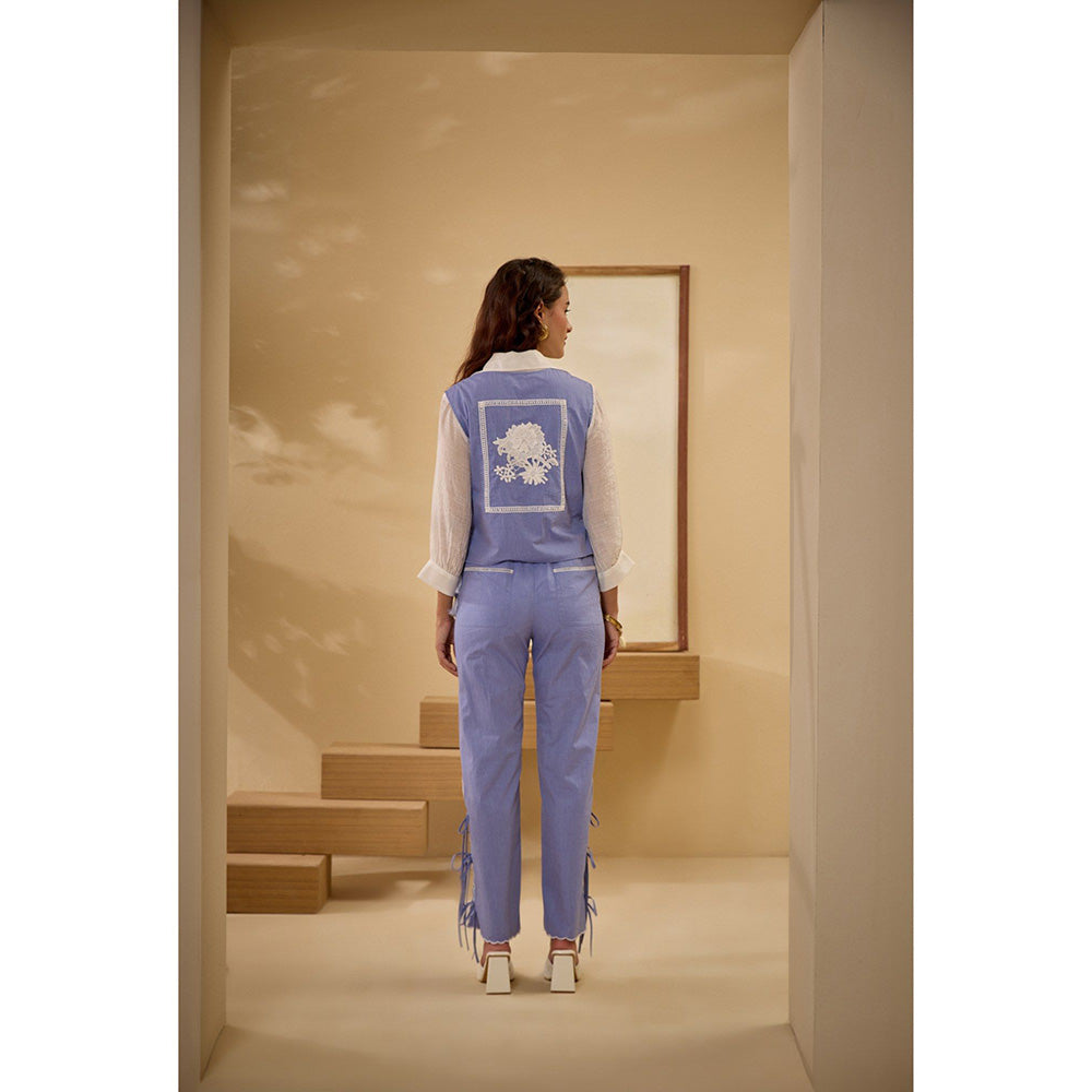 Description : Vest :Cropped Embroidered Vest boxy Fit side & Front Open tassels & Ties On The Side macram Buttons, Shirt :Shirt In Linen Crepe front Open concealed Placket Pants :Pants Elasticated Waistband At The Back front Opening embroidery & Ties On The Side fabric :Melange Cotton Chambray