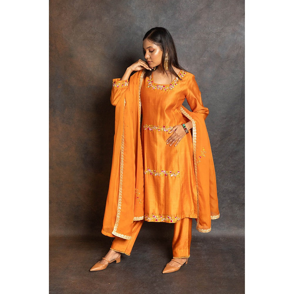 LABEL KIARSH Rust Orange Embellished Kurta with Pant and Dupatta (Set of 3)