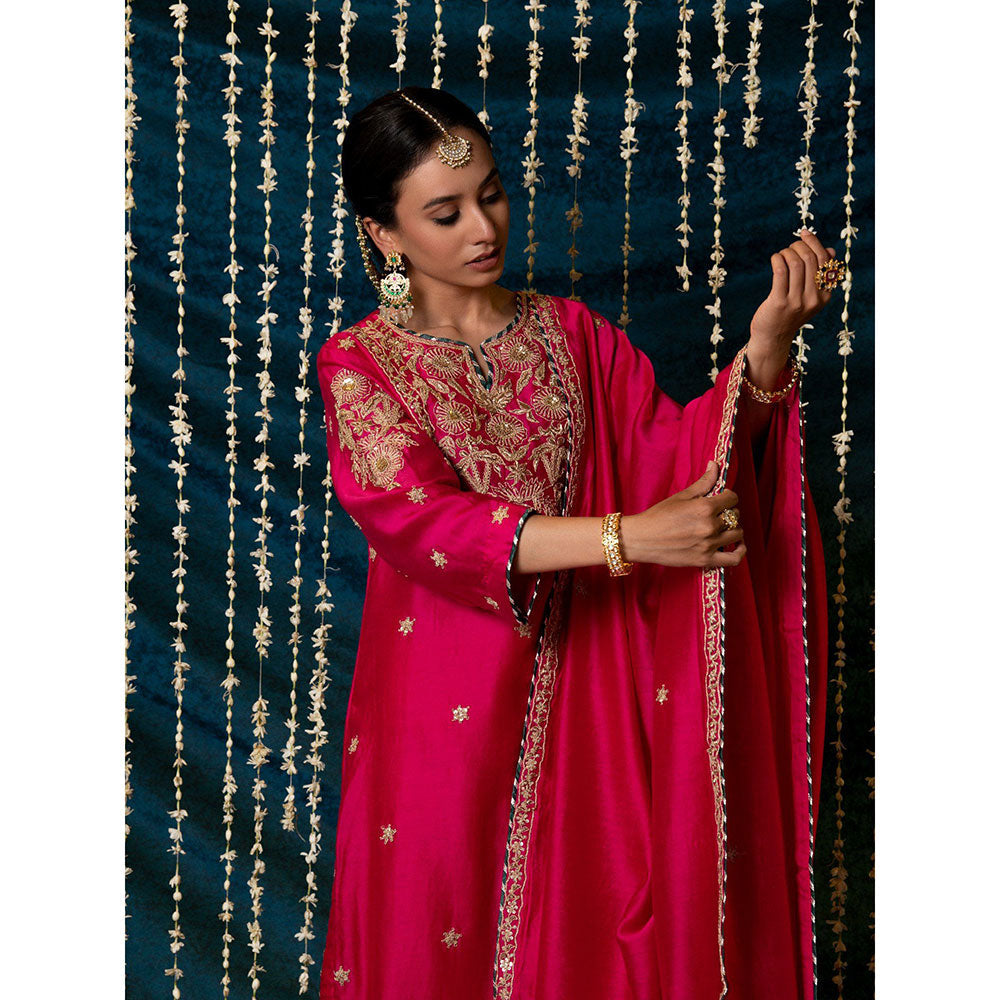 Description : Jashn-E-Ulfat - a collection of ensembles that evoke a sense of majestic opulence and modern royalty. Suffused with deep rich hues set on plush cotton silk enhanced with remarkable craftsmanship like Marodi, Mirror and Zardozi embroidery, each ensemble has a romantic and feminine charm of its own . This set of 3 consists of a Kurta, Farshi Pajama and Dupatta. KURTA: This hot pink chanderi silk kurta is enhanced with handcrafted zardozi, sitara and jaal work on the neck, buttas on the sleeves and delicately handcrafted buttis all over. The kurta has been finished with hand made magzi in a contrast green color. BOTTOM: The kurta is paired with farshi pants made in a soft modal cotton fabric detailed with delicate butti work at the hem. DUPATTA: The set is styled with a chanderi silk dupatta with buttas all over and finished with magzi detailing.