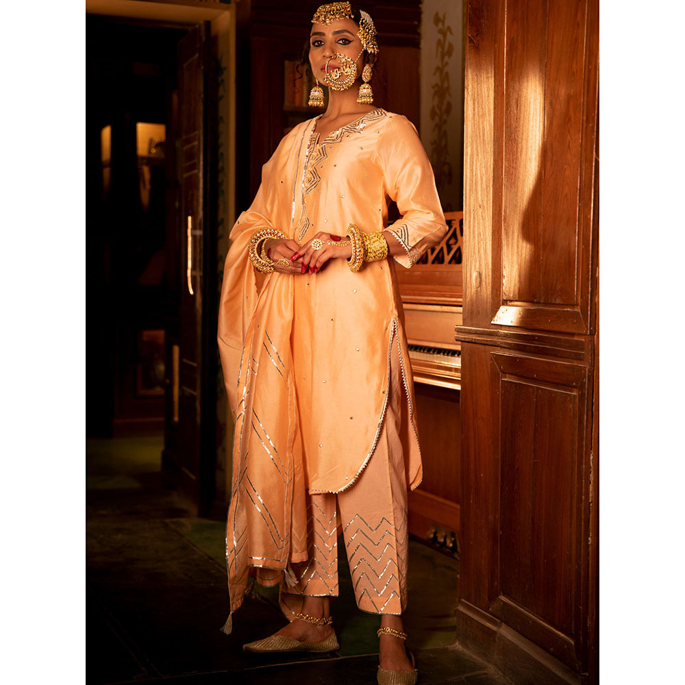 Description : Enter the world of luxurious & regal clothing with Sahiba. Celebrate the grandeur of beauty, celebrations, dressing up and womanhood with vintage textiles and silhouettes. Set of 3 consists of kurta, pants and dupatta. KURTA: A pink chanderi silk kurta is detailed with silver gota embroidery . DUPATTA: A pink chanderi silk dupatta is detailed with hand embroidered gota dhari work and tassels. PANTS: Combined with pink cotton pants with gota embroidery