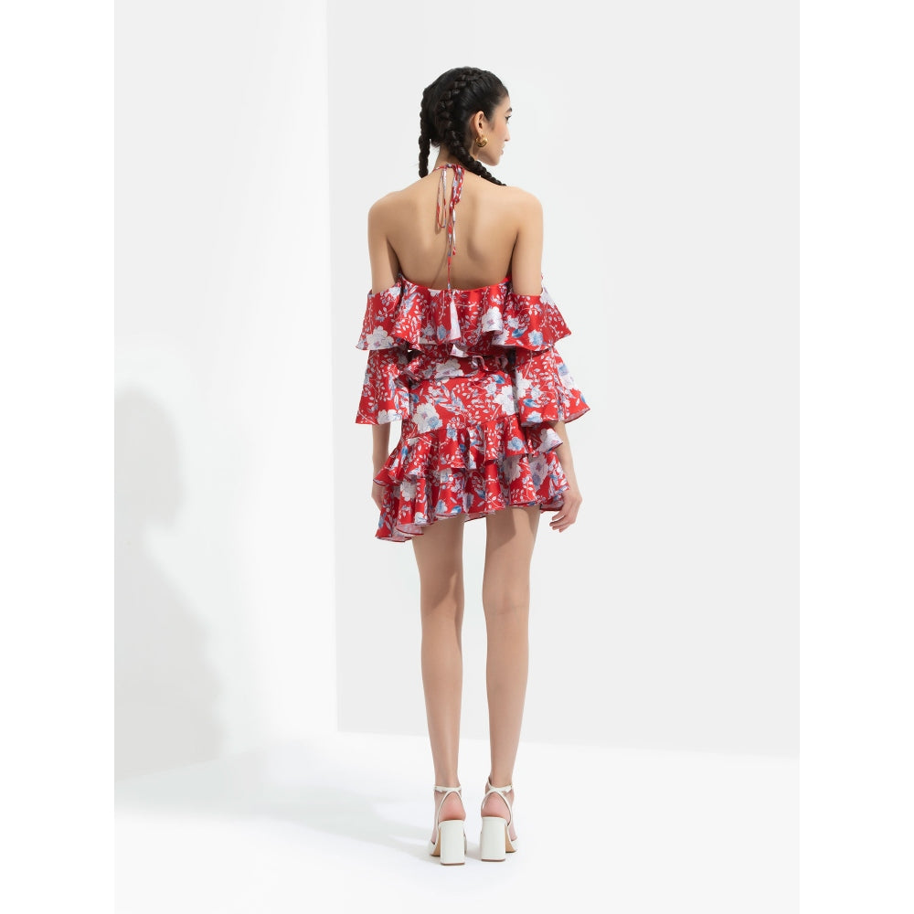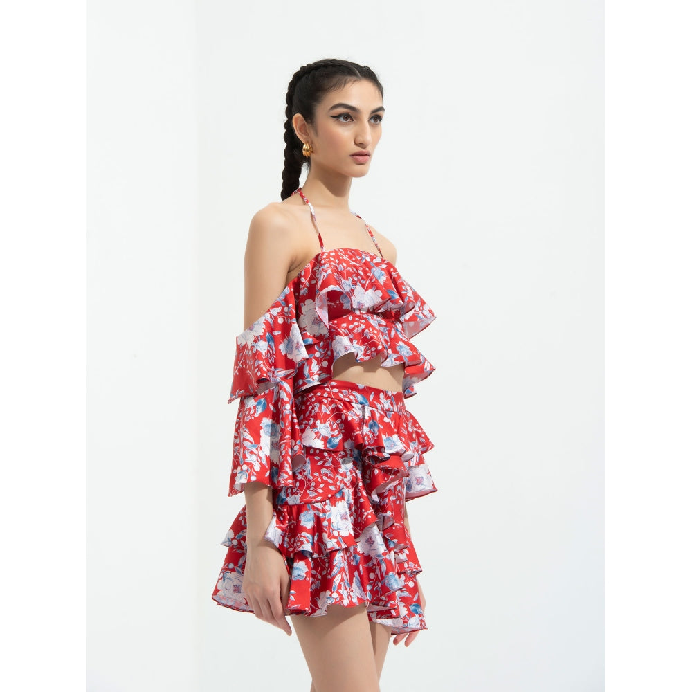 MANDIRA WIRK Ajisia Printed Cold Shoulder Blouse Paired with Short Skirt Red (Set of 2)