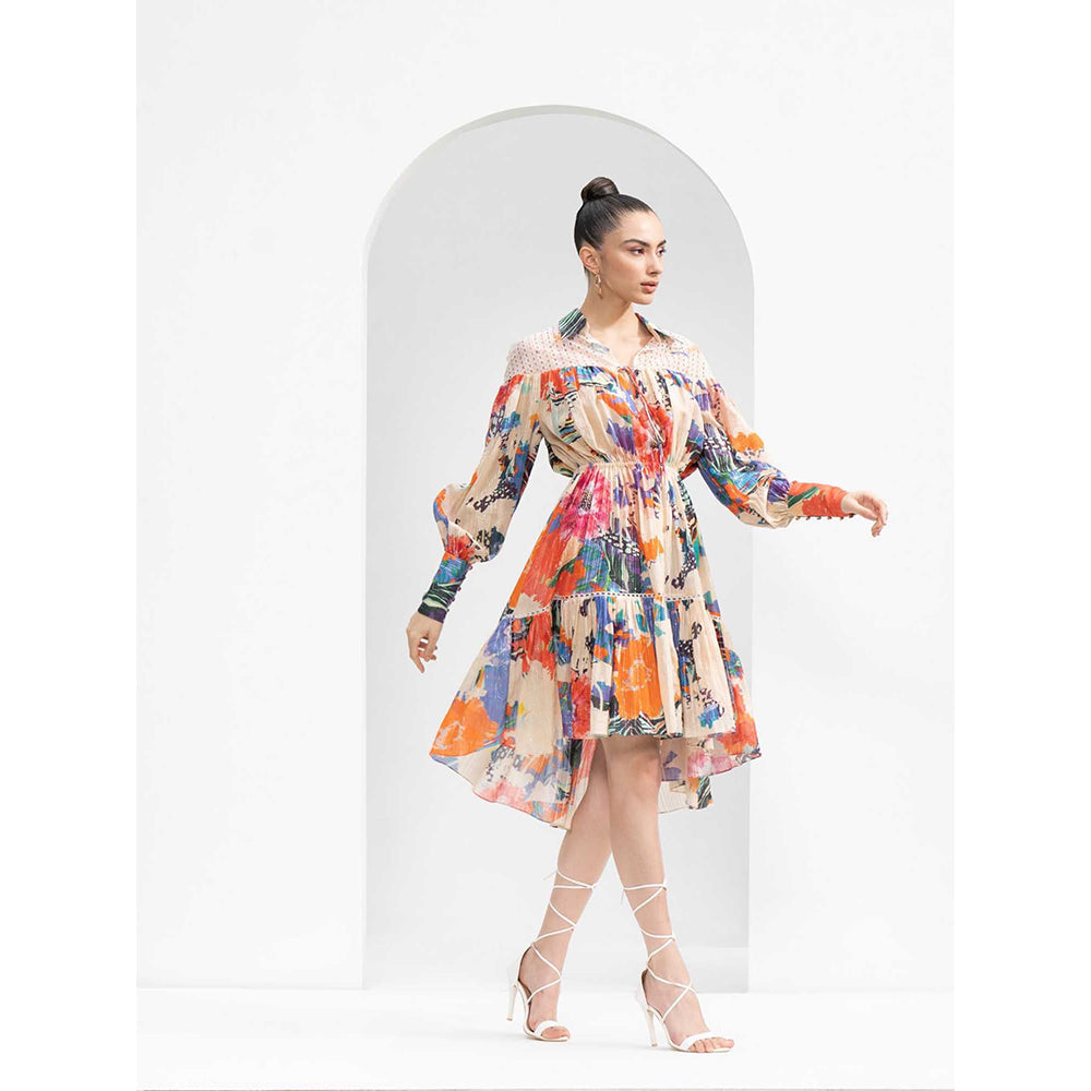 MANDIRA WIRK Ivory Garden Lurex Cotton Short Dress with Cutwork Chantley Detailing