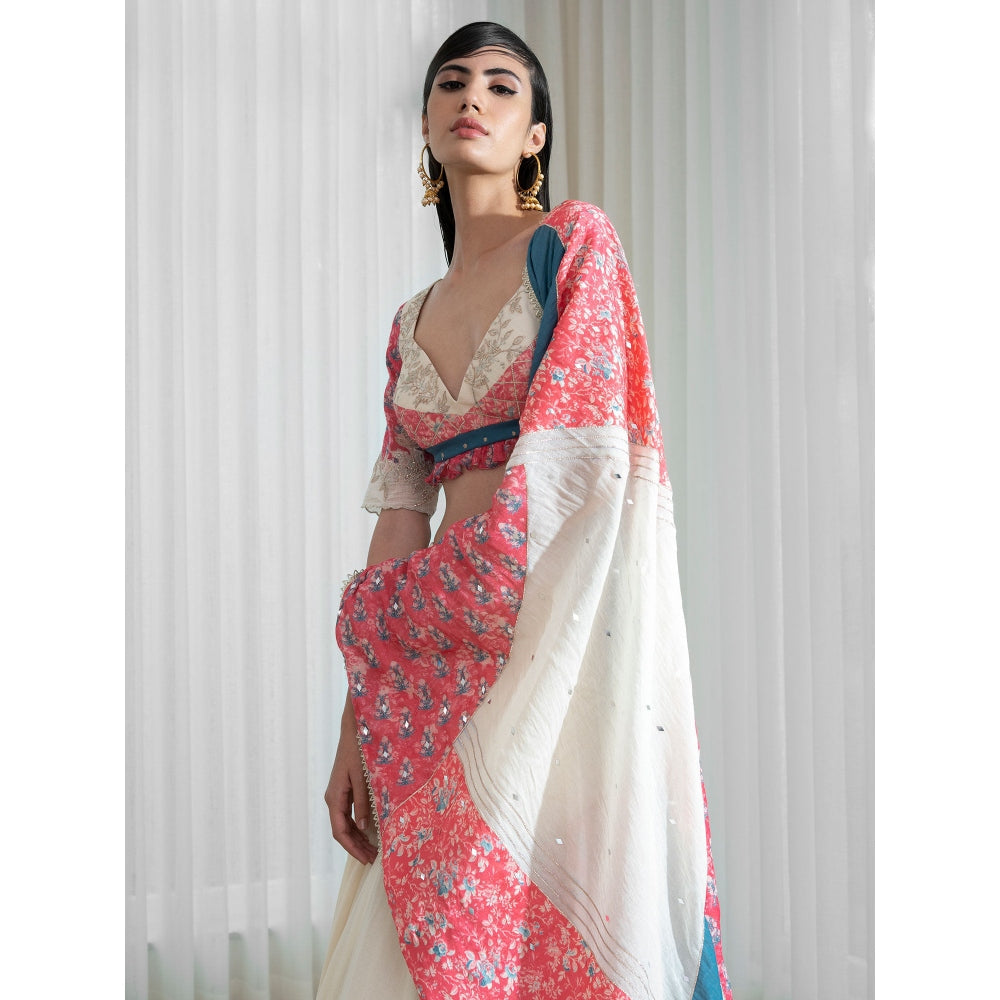 Description : Ivory patchwork blouse and dupatta with print and solid colour placements; gota and zari work styled with ivory skirt with gota detail at hem