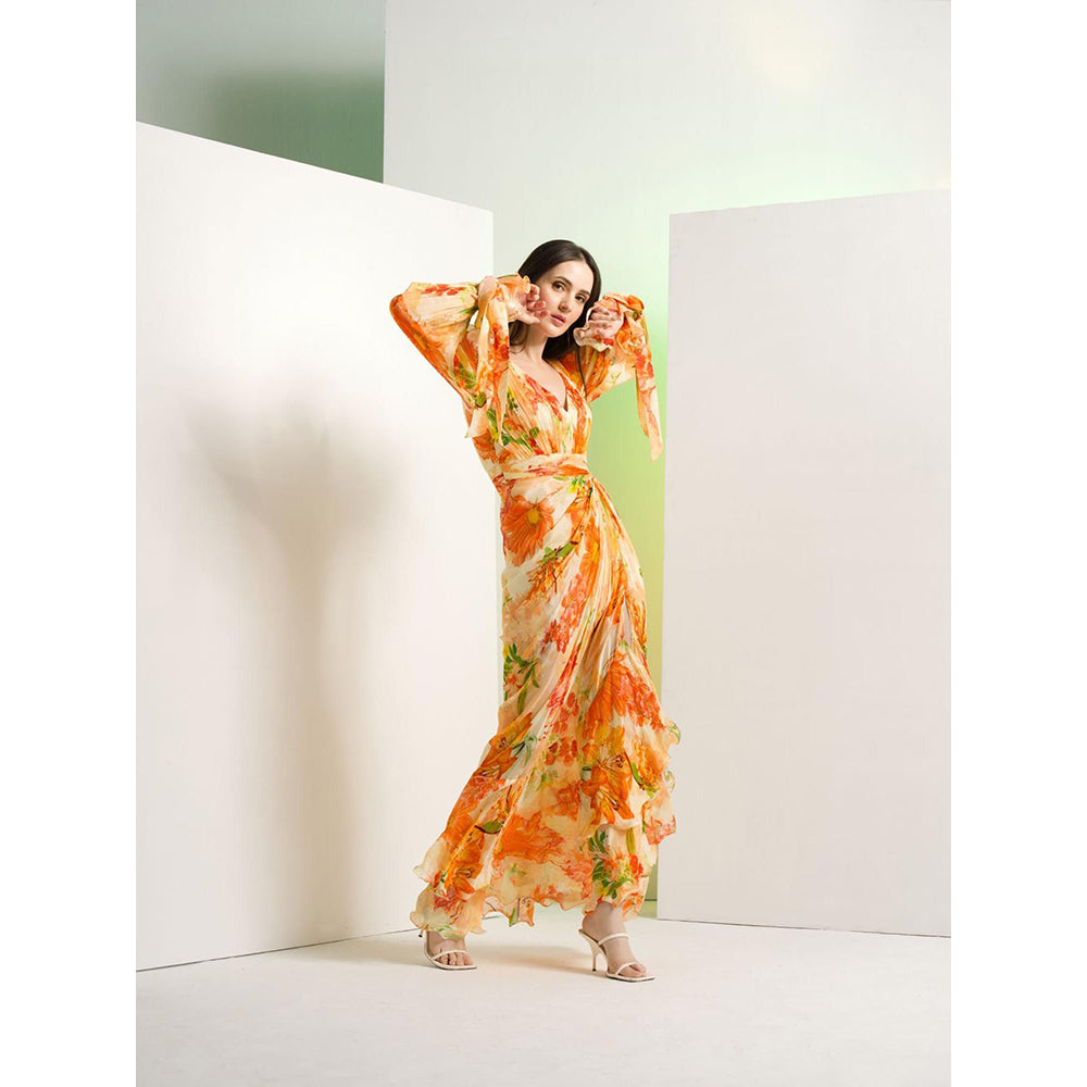 MANDIRA WIRK Orange Lilium Chiffon Dress with Waist Buckle Details